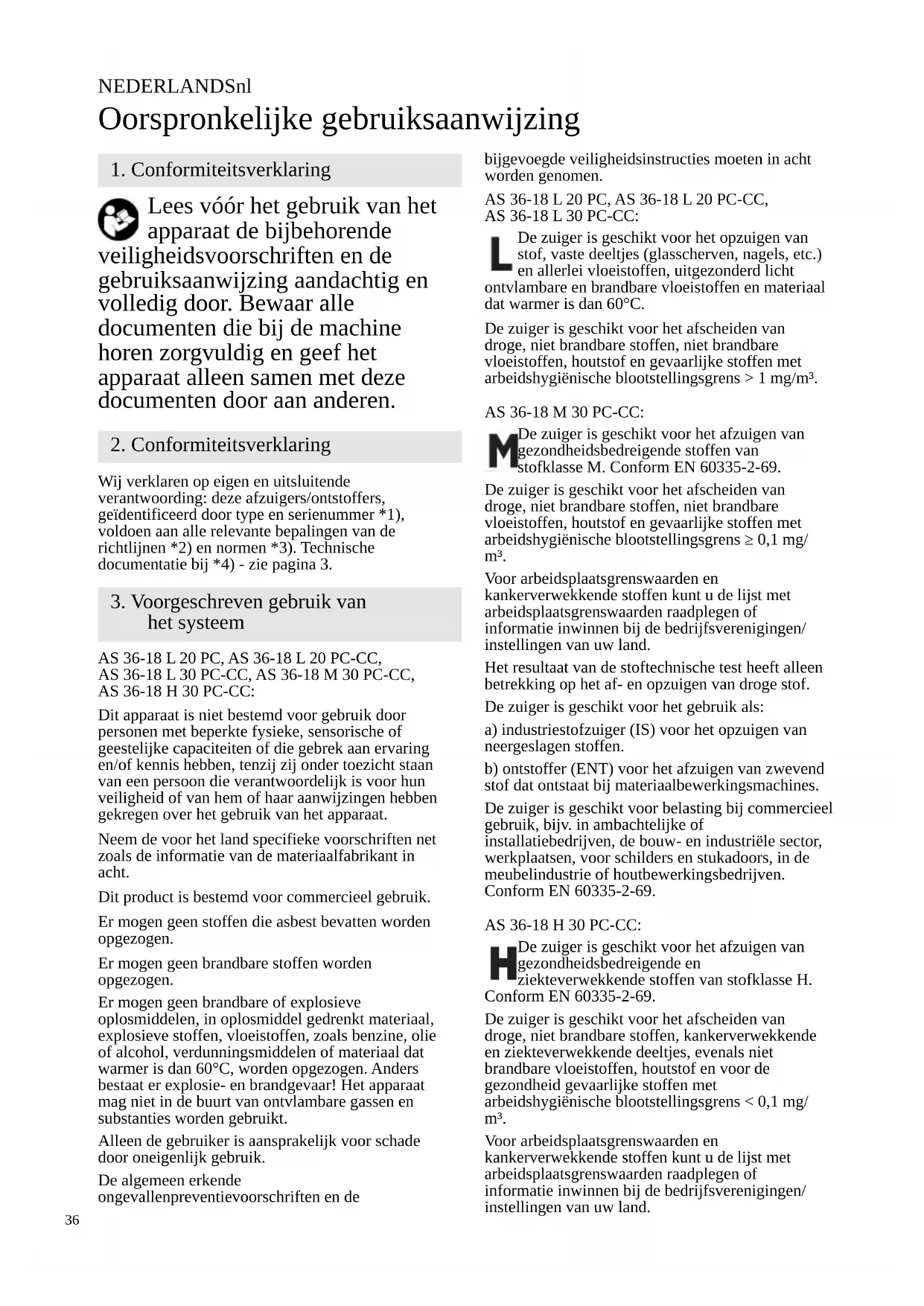 Oorspronkelijke gebruiksaanwijzing Lees vóór het gebruik van het apparaat de bijbehorende veiligheidsvoorschriften en de gebruiksaanwijzing aandachtig en volledig door. Bewaar alle documenten die bij de machine horen zorgvuldig en geef het apparaat alleen samen met deze documenten door aan anderen. Wij verklaren op eigen en uitsluitende verantwoording: deze afzuigers/ontstoffers, geïdentificeerd door type en serienummer *1), voldoen aan alle relevante bepalingen van de richtlijnen *2) en normen *3). Technische documentatie bij *4) - zie pagina 3. AS 36-18 L 20 PC, AS 36-18 L 20 PC-CC, AS 36-18 L 30 PC-CC, AS 36-18 M 30 PC-CC, AS 36-18 H 30 PC-CC: Dit apparaat is niet bestemd voor gebruik door personen met beperkte fysieke, sensorische of geestelijke capaciteiten of die gebrek aan ervaring en/of kennis hebben, tenzij zij onder toezicht staan van een persoon die verantwoordelijk is voor hun veiligheid of van hem of haar aanwijzingen hebben gekregen over het gebruik van het apparaat. Neem de voor het land specifieke voorschriften net zoals de informatie van de materiaalfabrikant in acht. Dit product is bestemd voor commercieel gebruik. Er mogen geen stoffen die asbest bevatten worden opgezogen. Er mogen geen brandbare stoffen worden opgezogen. Er mogen geen brandbare of explosieve oplosmiddelen, in oplosmiddel gedrenkt materiaal, explosieve stoffen, vloeistoffen, zoals benzine, olie of alcohol, verdunningsmiddelen of materiaal dat warmer is dan 60°C, worden opgezogen. Anders bestaat er explosie- en brandgevaar! Het apparaat mag niet in de buurt van ontvlambare gassen en substanties worden gebruikt. Alleen de gebruiker is aansprakelijk voor schade door oneigenlijk gebruik. De algemeen erkende ongevallenpreventievoorschriften en de bijgevoegde veiligheidsinstructies moeten in acht worden genomen. AS 36-18 L 20 PC, AS 36-18 L 20 PC-CC, AS 36-18 L 30 PC-CC: De zuiger is geschikt voor het opzuigen van stof, vaste deeltjes (glasscherven, nagels, etc.) en allerlei vloeistoffen, uitgezonderd licht ontvlambare en brandbare vloeistoffen en materiaal dat warmer is dan 60°C. De zuiger is geschikt voor het afscheiden van droge, niet brandbare stoffen, niet brandbare vloeistoffen, houtstof en gevaarlijke stoffen met arbeidshygiënische blootstellingsgrens > 1 mg/m³. AS 36-18 M 30 PC-CC: De zuiger is geschikt voor het afzuigen van gezondheidsbedreigende stoffen van stofklasse M. Conform EN 60335-2-69. De zuiger is geschikt voor het afscheiden van droge, niet brandbare stoffen, niet brandbare vloeistoffen, houtstof en gevaarlijke stoffen met arbeidshygiënische blootstellingsgrens ≥ 0,1 mg/ m³. Voor arbeidsplaatsgrenswaarden en kankerverwekkende stoffen kunt u de lijst met arbeidsplaatsgrenswaarden raadplegen of informatie inwinnen bij de bedrijfsverenigingen/ instellingen van uw land. Het resultaat van de stoftechnische test heeft alleen betrekking op het af- en opzuigen van droge stof. De zuiger is geschikt voor het gebruik als: a) industriestofzuiger (IS) voor het opzuigen van neergeslagen stoffen. b) ontstoffer (ENT) voor het afzuigen van zwevend stof dat ontstaat bij materiaalbewerkingsmachines. De zuiger is geschikt voor belasting bij commercieel gebruik, bijv. in ambachtelijke of installatiebedrijven, de bouw- en industriële sector, werkplaatsen, voor schilders en stukadoors, in de meubelindustrie of houtbewerkingsbedrijven. Conform EN 60335-2-69. AS 36-18 H 30 PC-CC: De zuiger is geschikt voor het afzuigen van gezondheidsbedreigende en ziekteverwekkende stoffen van stofklasse H. Conform EN 60335-2-69. De zuiger is geschikt voor het afscheiden van droge, niet brandbare stoffen, kankerverwekkende en ziekteverwekkende deeltjes, evenals niet brandbare vloeistoffen, houtstof en voor de gezondheid gevaarlijke stoffen met arbeidshygiënische blootstellingsgrens < 0,1 mg/ m³. Voor arbeidsplaatsgrenswaarden en kankerverwekkende stoffen kunt u de lijst met arbeidsplaatsgrenswaarden raadplegen of informatie inwinnen bij de bedrijfsverenigingen/ instellingen van uw land.