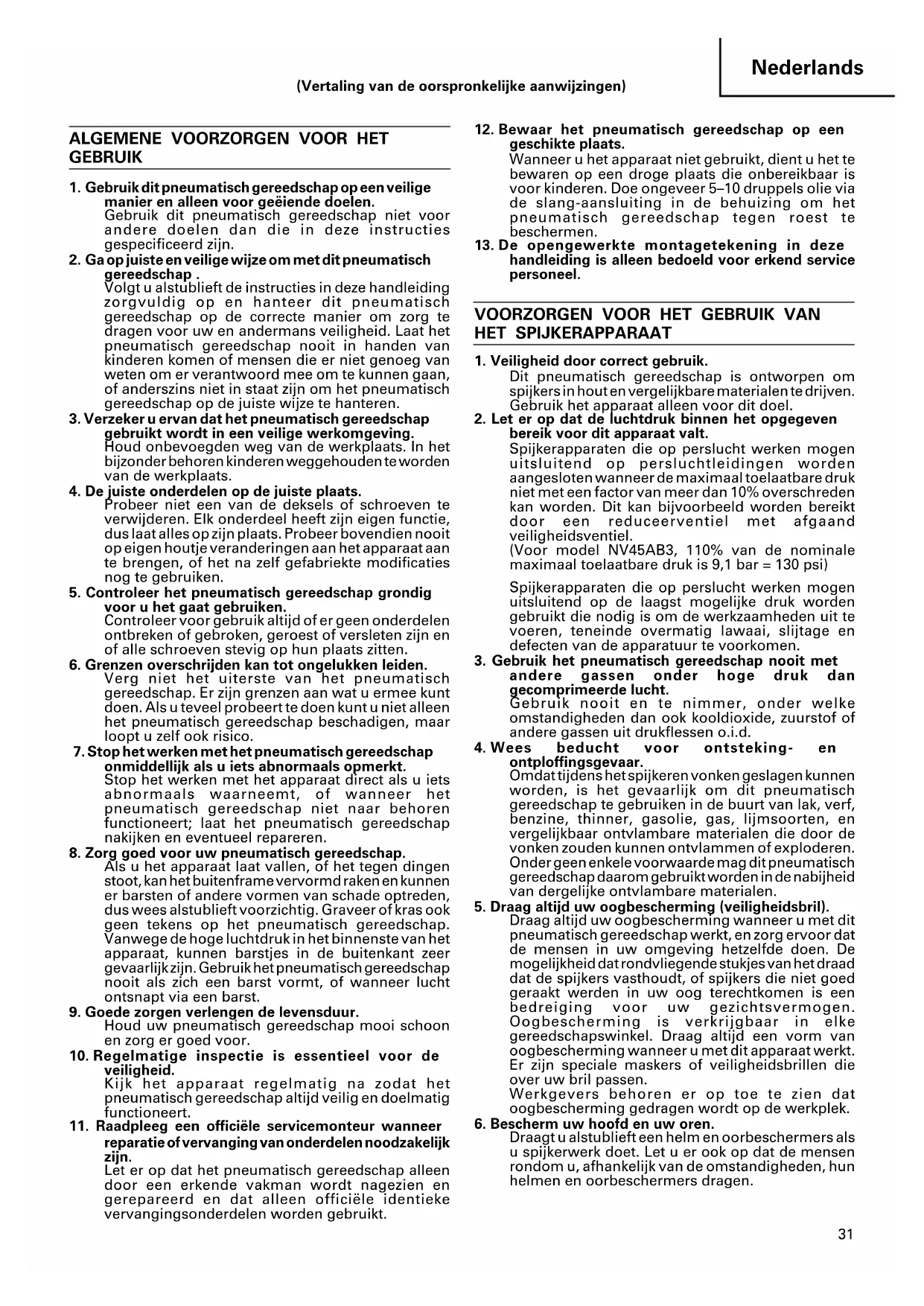 bereik voor dit apparaat valt. Spijkerapparaten die op perslucht werken mogen uitsluitend op persluchtleidingen worden aangesloten wanneer de maximaal toelaatbare druk niet met een factor van meer dan 10% overschreden kan worden. Dit kan bijvoorbeeld worden bereikt door een reduceerventiel met afgaand veiligheidsventiel. (Voor model NV45AB3, 110% van de nominale maximaal toelaatbare druk is 9,1 bar = 130 psi) Spijkerapparaten die op perslucht werken mogen uitsluitend op de laagst mogelijke druk worden gebruikt die nodig is om de werkzaamheden uit te voeren, teneinde overmatig lawaai, slijtage en defecten van de apparatuur te voorkomen.