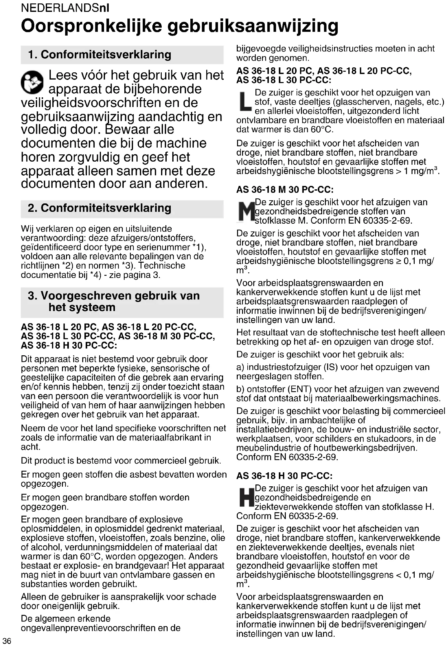 Oorspronkelijke gebruiksaanwijzing Lees vóór het gebruik van het apparaat de bijbehorende veiligheidsvoorschriften en de gebruiksaanwijzing aandachtig en volledig door. Bewaar alle documenten die bij de machine horen zorgvuldig en geef het apparaat alleen samen met deze documenten door aan anderen. Wij verklaren op eigen en uitsluitende verantwoording: deze afzuigers/ontstoffers, geïdentificeerd door type en serienummer *1), voldoen aan alle relevante bepalingen van de richtlijnen *2) en normen *3). Technische documentatie bij *4) - zie pagina 3. AS 36-18 L 20 PC, AS 36-18 L 20 PC-CC, AS 36-18 L 30 PC-CC, AS 36-18 M 30 PC-CC, AS 36-18 H 30 PC-CC: Dit apparaat is niet bestemd voor gebruik door personen met beperkte fysieke, sensorische of geestelijke capaciteiten of die gebrek aan ervaring en/of kennis hebben, tenzij zij onder toezicht staan van een persoon die verantwoordelijk is voor hun veiligheid of van hem of haar aanwijzingen hebben gekregen over het gebruik van het apparaat. Neem de voor het land specifieke voorschriften net zoals de informatie van de materiaalfabrikant in acht. Dit product is bestemd voor commercieel gebruik. Er mogen geen stoffen die asbest bevatten worden opgezogen. Er mogen geen brandbare stoffen worden opgezogen. Er mogen geen brandbare of explosieve oplosmiddelen, in oplosmiddel gedrenkt materiaal, explosieve stoffen, vloeistoffen, zoals benzine, olie of alcohol, verdunningsmiddelen of materiaal dat warmer is dan 60°C, worden opgezogen. Anders bestaat er explosie- en brandgevaar! Het apparaat mag niet in de buurt van ontvlambare gassen en substanties worden gebruikt. Alleen de gebruiker is aansprakelijk voor schade door oneigenlijk gebruik. De algemeen erkende ongevallenpreventievoorschriften en de bijgevoegde veiligheidsinstructies moeten in acht worden genomen. AS 36-18 L 20 PC, AS 36-18 L 20 PC-CC, AS 36-18 L 30 PC-CC: De zuiger is geschikt voor het opzuigen van stof, vaste deeltjes (glasscherven, nagels, etc.) en allerlei vloeistoffen, uitgezonderd licht ontvlambare en brandbare vloeistoffen en materiaal dat warmer is dan 60°C. De zuiger is geschikt voor het afscheiden van droge, niet brandbare stoffen, niet brandbare vloeistoffen, houtstof en gevaarlijke stoffen met arbeidshygiënische blootstellingsgrens > 1 mg/m³. AS 36-18 M 30 PC-CC: De zuiger is geschikt voor het afzuigen van gezondheidsbedreigende stoffen van stofklasse M. Conform EN 60335-2-69. De zuiger is geschikt voor het afscheiden van droge, niet brandbare stoffen, niet brandbare vloeistoffen, houtstof en gevaarlijke stoffen met arbeidshygiënische blootstellingsgrens ≥ 0,1 mg/ m³. Voor arbeidsplaatsgrenswaarden en kankerverwekkende stoffen kunt u de lijst met arbeidsplaatsgrenswaarden raadplegen of informatie inwinnen bij de bedrijfsverenigingen/ instellingen van uw land. Het resultaat van de stoftechnische test heeft alleen betrekking op het af- en opzuigen van droge stof. De zuiger is geschikt voor het gebruik als: a) industriestofzuiger (IS) voor het opzuigen van neergeslagen stoffen. b) ontstoffer (ENT) voor het afzuigen van zwevend stof dat ontstaat bij materiaalbewerkingsmachines. De zuiger is geschikt voor belasting bij commercieel gebruik, bijv. in ambachtelijke of installatiebedrijven, de bouw- en industriële sector, werkplaatsen, voor schilders en stukadoors, in de meubelindustrie of houtbewerkingsbedrijven. Conform EN 60335-2-69. AS 36-18 H 30 PC-CC: De zuiger is geschikt voor het afzuigen van gezondheidsbedreigende en ziekteverwekkende stoffen van stofklasse H. Conform EN 60335-2-69. De zuiger is geschikt voor het afscheiden van droge, niet brandbare stoffen, kankerverwekkende en ziekteverwekkende deeltjes, evenals niet brandbare vloeistoffen, houtstof en voor de gezondheid gevaarlijke stoffen met arbeidshygiënische blootstellingsgrens < 0,1 mg/ m³. Voor arbeidsplaatsgrenswaarden en kankerverwekkende stoffen kunt u de lijst met arbeidsplaatsgrenswaarden raadplegen of informatie inwinnen bij de bedrijfsverenigingen/ instellingen van uw land.