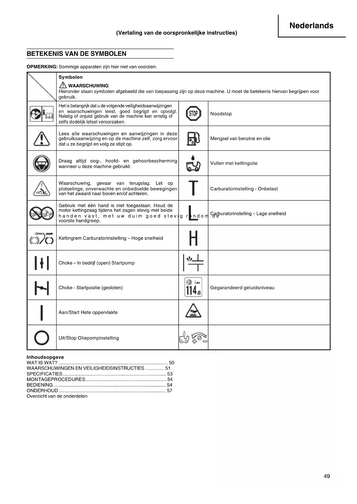 Gegarandeerd geluidsniveau Aan/Start Hete oppervlakte Uit/Stop Oliepompinstelling Inhoudsopgave