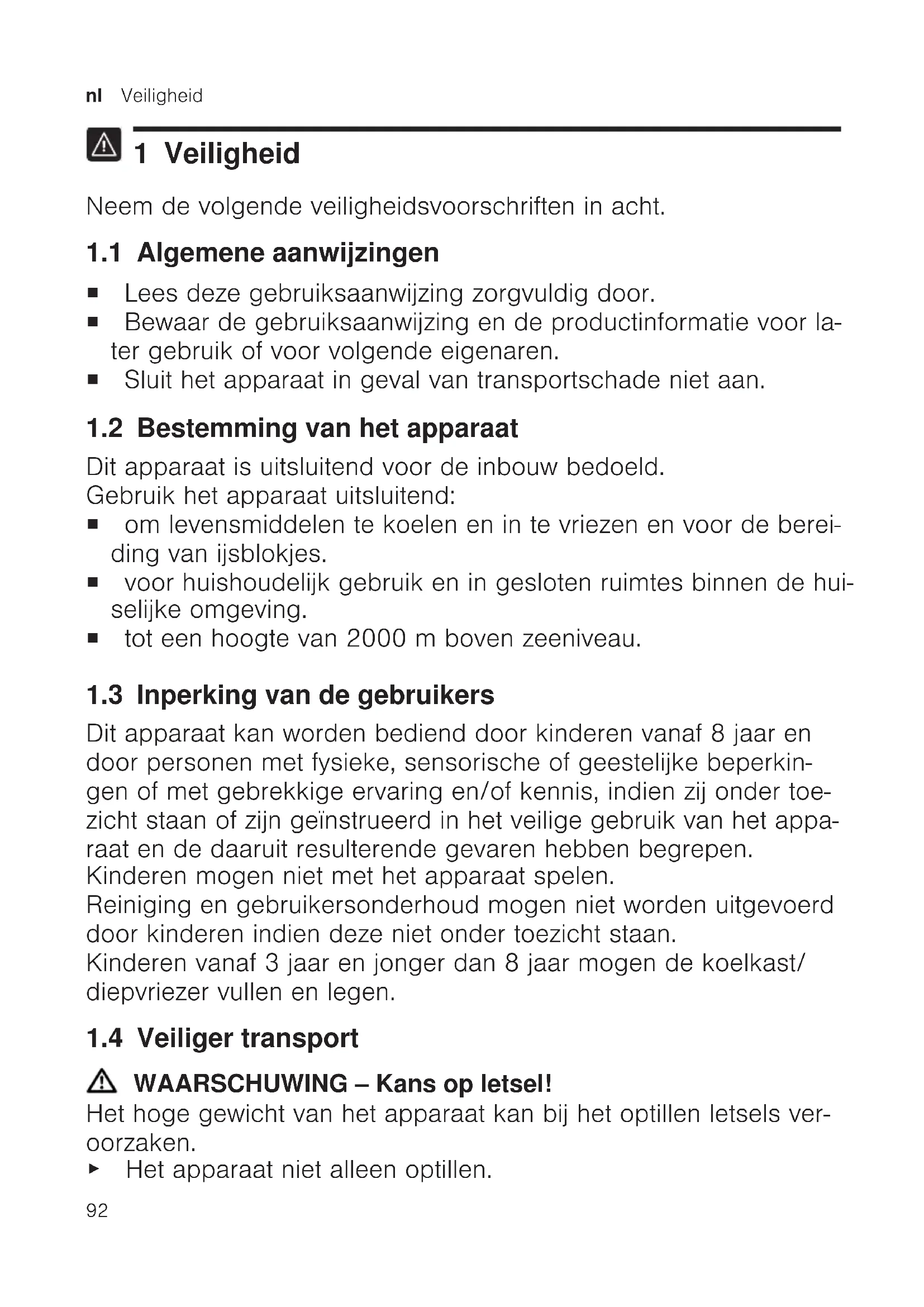 1 Veiligheid Neem de volgende veiligheidsvoorschriften in acht. 1.1 Algemene aanwijzingen ¡ Lees deze gebruiksaanwijzing zorgvuldig door. ¡ Bewaar de gebruiksaanwijzing en de productinformatie voor la- ter gebruik of voor volgende eigenaren. ¡ Sluit het apparaat in geval van transportschade niet aan. 1.2 Bestemming van het apparaat Dit apparaat is uitsluitend voor de inbouw bedoeld. Gebruik het apparaat uitsluitend: ¡ om levensmiddelen te koelen en in te vriezen en voor de berei- ding van ijsblokjes. ¡ voor huishoudelijk gebruik en in gesloten ruimtes binnen de hui- selijke omgeving. ¡ tot een hoogte van 2000m boven zeeniveau. 1.3 Inperking van de gebruikers Dit apparaat kan worden bediend door kinderen vanaf 8 jaar en door personen met fysieke, sensorische of geestelijke beperkin- gen of met gebrekkige ervaring en/of kennis, indien zij onder toe- zicht staan of zijn geïnstrueerd in het veilige gebruik van het appa- raat en de daaruit resulterende gevaren hebben begrepen. Kinderen mogen niet met het apparaat spelen. Reiniging en gebruikersonderhoud mogen niet worden uitgevoerd door kinderen indien deze niet onder toezicht staan. Kinderen vanaf 3 jaar en jonger dan 8 jaar mogen de koelkast/ diepvriezer vullen en legen. 1.4 Veiliger transport WAARSCHUWING‒Kans op letsel! Het hoge gewicht van het apparaat kan bij het optillen letsels ver- oorzaken. ▶ Het apparaat niet alleen optillen.Veiligheid nl