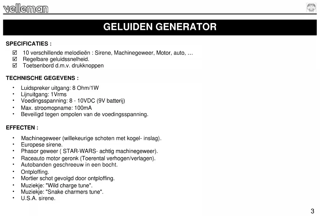 K440123 SPECIFICATIES : 10 verschillende melodieën : Sirene, Machinegeweer, Motor, auto, … Regelbare geluidssnelheid. Toetsenbord d.m.v. drukknoppen TECHNISCHE GEGEVENS : Luidspreker uitgang: 8 Ohm/1W Lijnuitgang: 1Vrms Voedingsspanning: 8 - 10VDC (9V batterij) Max. stroomopname: 100mA Beveiligd tegen ompolen van de voedingsspanning. EFFECTEN : Machinegeweer (willekeurige schoten met kogel- inslag). Europese sirene. Phasor geweer ( STAR-WARS- achtig machinegeweer). Raceauto motor geronk (Toerental verhogen/verlagen). Autobanden geschreeuw in een bocht. Ontploffing. Mortier schot gevolgd door ontploffing. Muziekje: "Wild charge tune". Muziekje: "Snake charmers tune". U.S.A. sirene. GELUIDEN GENERATOR4