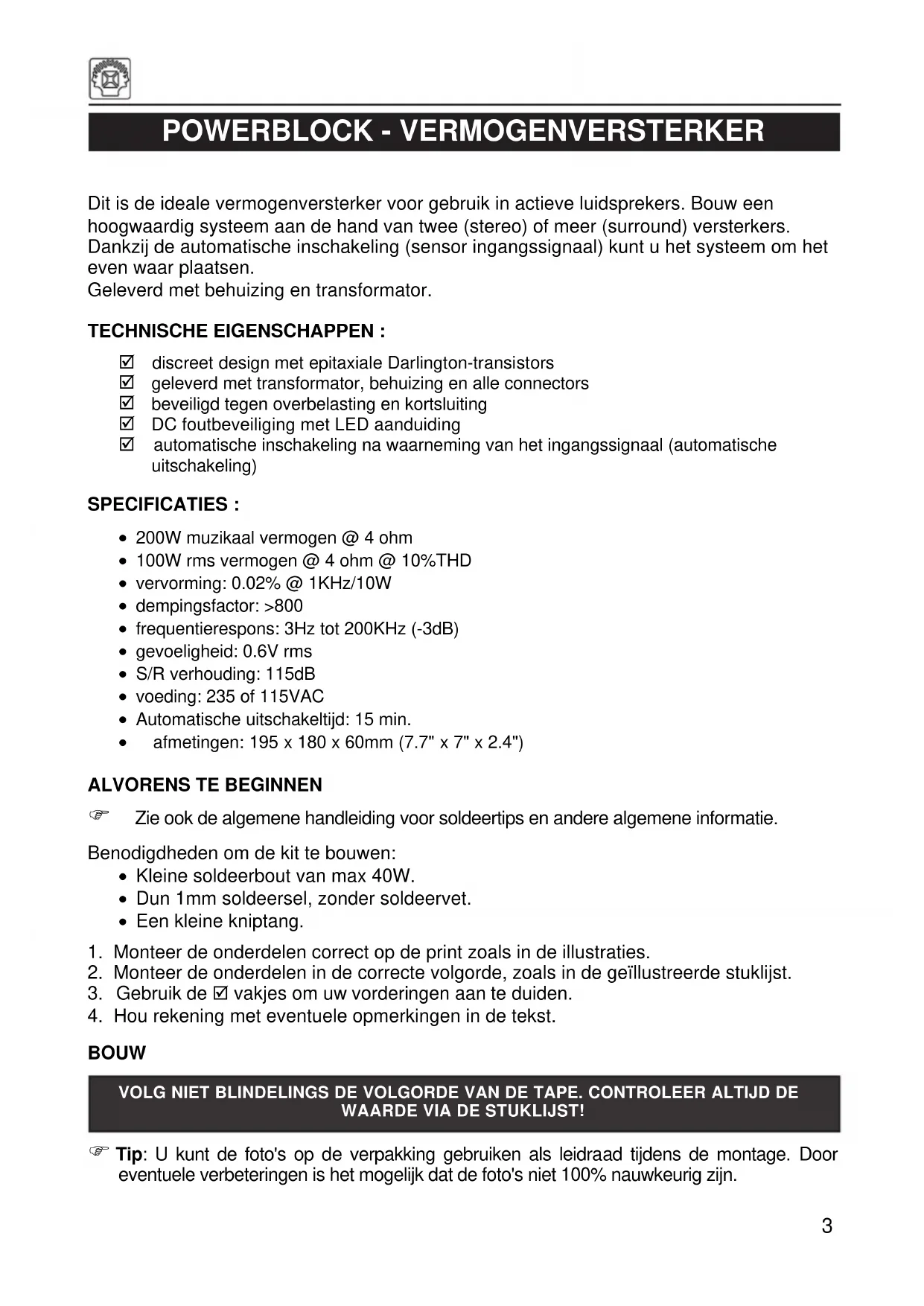 (1) Knip alle soldeeraansluitingen aan de soldeerzijde af tot een maximale hoogte van 1.5mm. Zorg dat de soldeeraansluitingen aan de soldeerzijde geen contact kunnen maken met de behuizing. (2) Kleef het rubberen voetje centraal op de soldeerzijde van de printplaat. (3) Schuif de printplaat in de behuizing (zie foto). (4) Bevestig de printplaat aan de behuizing met behulp van de 4 bevestigingsteunen, bouten en moeren (zie foto). (5) Buig condensator C4 en C5 weg van transistoraansluiting T9 en T8. (6) Breng een beetje warmtegeleidende pasta aan op transistor T7 en diode D11. (7) Monteer een M3 bout waar transistor T8 en T9 aan de koelbalk worden vastgezet.Plaats daarna de isolerende mica met aan beide zijden wat warmtegeleidende pasta (zie foto). (8) Buig de aansluitingen van transistor T8 en T9 volgens de foto. (9) Plaats transistors T8 en T9 op de koelbalk en zet deze vast met behulp van een borgring en moer (zie foto). (10) Soldeer nu voorzichtig de aansluitingen aan de pinheaders (zie foto). Controleer de soldering door de transistoraansluitingen te proberen bewegen. (11) Schuif een isolatiehuls over beide luidsprekerkabels (zwarte en rode draad van 1.5mm²). Monteer daarna een vrouwelijke connector en schuif daarna de isolatiehuls over deze connector. Sluit aan de andere zijde een ringoogconnector (verwijder eerst de isolatie van deze connector) (zie foto).5 (12) Monteer de mannelijk netaansluiting- en luidsprekerconnector, schakelaar en zekeringhouder. Controleer de positie van de luidsprekeraansluiting en de schakelaar op het achterpaneel. (13) Plaats de zekeringhouder zoals aangegeven op de foto. (14) Richt de moer op één lijn volgens de foto. (15) Soldeer de vrouwelijke 2-aderige connectorkabel aan de RCA-aansluiting (bruin = massa, rood = signaal). Twist nadien deze kabel. (16) Verbind de luidsprekerkabels met de ringoogconnector aan de luidsprekerconnector zoals aangegeven op de foto (+ = rood). (17) Plaats de 2A trage zekering. (18) Knip de meegeleverde krimpkous in 3 even grote stukken. (19) Soldeer een draad van 8cm aan de schakelaar en één aan de zekeringhouder (zie foto). (20) - Schuif een krimpkous over de zwarte aansluitdraad van de transformator en één over de bruine (~ 100 - 120VAC) of de oranje draad (~220 - 245VAC), afhankelijk van de voedingsspanning van uw land. - Verbind de zwarte draad met voedingschakelaar. - Verbind de oranje of bruine draad (afhankelijk van de voedingspanning) met de zekeringhouder (middenaansluiting). (21) Schuif de krimpkousen over de aansluitingen van zowel de zekeringhouder en de voedingsschakelaar. (22) Isoleer de ongebruikte draad van de transformator met behulp van bv. tape. (23) Verwarm de krimpkousen met een haardroger of, beter nog, met een verfstripper. (24) Plaats lijm op de isolatiemat van de transformator. (25) Monteer deze isolatiemat in de behuizing zoals aangegeven op de foto. (26) Soldeer aan iedere secundaire transformatorkabel een vrouwelijke connector met isolatiehuls. (27) Plaats het achterpaneel en de transformator. Bevestig de achterplaat vast aan de behuizing zoals aangegeven op de foto met behulp van 4 zelftappende schroeven. (28) Verbind de connector van het ingangssignaal (vrouwelijke 2-aderige getwiste connectorkabel) aan de mannelijke kabelconnector SK5. (29) Verbindt de secundaire transformatorkabels (rood, blauw, grijs en geel) met de overeenstemmende mannelijke vlakstekers op de printplaat. (30) Verbindt de 2 luidsprekerkabels aan de mannelijk vlakstekers (+LS en -LS). (31) Controleer de aansluitingen en bindt de kabels samen met kabelbinders. (32) Plaats de tweede isolatiering op de transformator (zie foto). (33) Kleef de isolatiefolie tussen de transformator en luidsprekerconnector (zie foto).