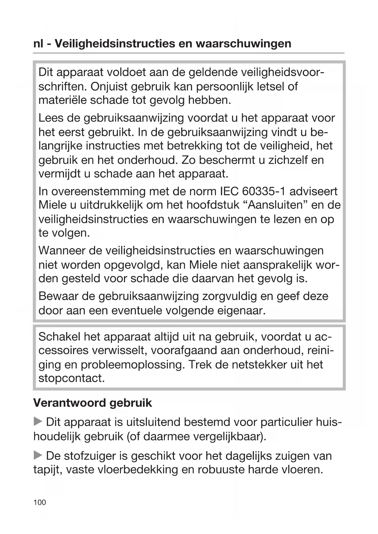 Dit apparaat voldoet aan de geldende veiligheidsvoor- schriften. Onjuist gebruik kan persoonlijk letsel of materiële schade tot gevolg hebben. Lees de gebruiksaanwijzing voordat u het apparaat voor het eerst gebruikt. In de gebruiksaanwijzing vindt u be- langrijke instructies met betrekking tot de veiligheid, het gebruik en het onderhoud. Zo beschermt u zichzelf en vermijdt u schade aan het apparaat. In overeenstemming met de norm IEC60335-1 adviseert Miele u uitdrukkelijk om het hoofdstuk “Aansluiten” en de veiligheidsinstructies en waarschuwingen te lezen en op te volgen. Wanneer de veiligheidsinstructies en waarschuwingen niet worden opgevolgd, kan Miele niet aansprakelijk wor- den gesteld voor schade die daarvan het gevolg is. Bewaar de gebruiksaanwijzing zorgvuldig en geef deze door aan een eventuele volgende eigenaar. Schakel het apparaat altijd uit na gebruik, voordat u ac- cessoires verwisselt, voorafgaand aan onderhoud, reini- ging en probleemoplossing. Trek de netstekker uit het stopcontact. Verantwoord gebruik Dit apparaat is uitsluitend bestemd voor particulier huis- houdelijk gebruik (of daarmee vergelijkbaar). De stofzuiger is geschikt voor het dagelijks zuigen van tapijt, vaste vloerbedekking en robuuste harde vloeren.nl - Veiligheidsinstructies en waarschuwingen