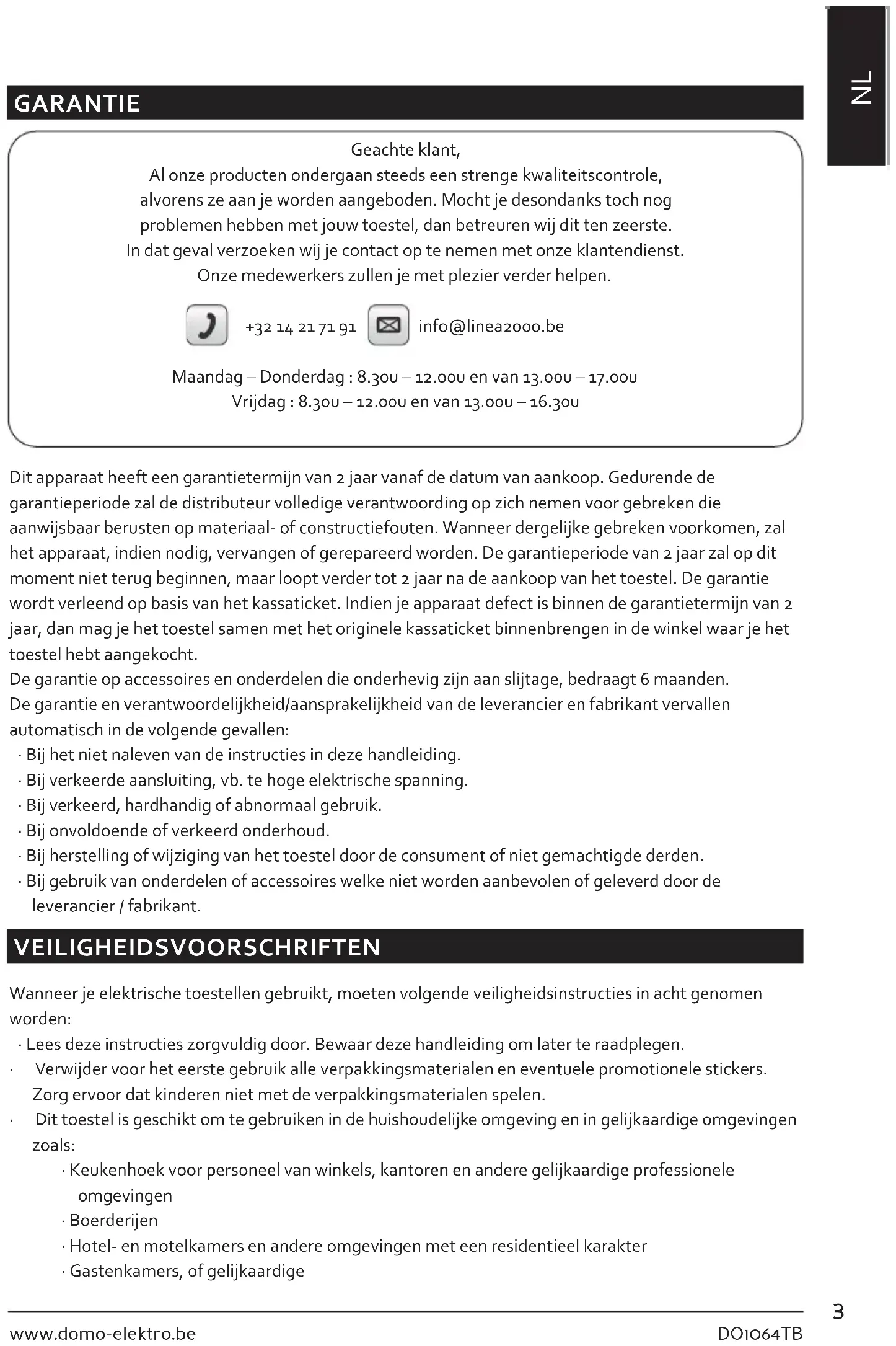 GARANTIE Geachte klant, Al onze producten ondergaan steeds een strenge kwaliteitscontrole, alvorens ze aan je worden aangeboden. Mocht je desondanks toch nog problemen hebben met jouw toestel, dan betreuren wij dit ten zeerste. In dat geval verzoeken wij je contact op te nemen met onze klantendienst. Onze medewerkers zullen je met plezier verder helpen. +32 14 21 71 91 info@linea2000.be Maandag – Donderdag : 8.30u – 12.00u en van 13.00u – 17.00u Vrijdag : 8.30u – 12.00u en van 13.00u – 16.30u Dit apparaat heeft een garantietermijn van 2 jaar vanaf de datum van aankoop. Gedurende de garantieperiode zal de distributeur volledige verantwoording op zich nemen voor gebreken die aanwijsbaar berusten op materiaal- of constructiefouten. Wanneer dergelijke gebreken voorkomen, zal het apparaat, indien nodig, vervangen of gerepareerd worden. De garantieperiode van 2 jaar zal op dit moment niet terug beginnen, maar loopt verder tot 2 jaar na de aankoop van het toestel. De garantie wordt verleend op basis van het kassaticket. Indien je apparaat defect is binnen de garantietermijn van 2 jaar, dan mag je het toestel samen met het originele kassaticket binnenbrengen in de winkel waar je het toestel hebt aangekocht. De garantie op accessoires en onderdelen die onderhevig zijn aan slijtage, bedraagt 6 maanden. De garantie en verantwoordelijkheid/aansprakelijkheid van de leverancier en fabrikant vervallen automatisch in de volgende gevallen: