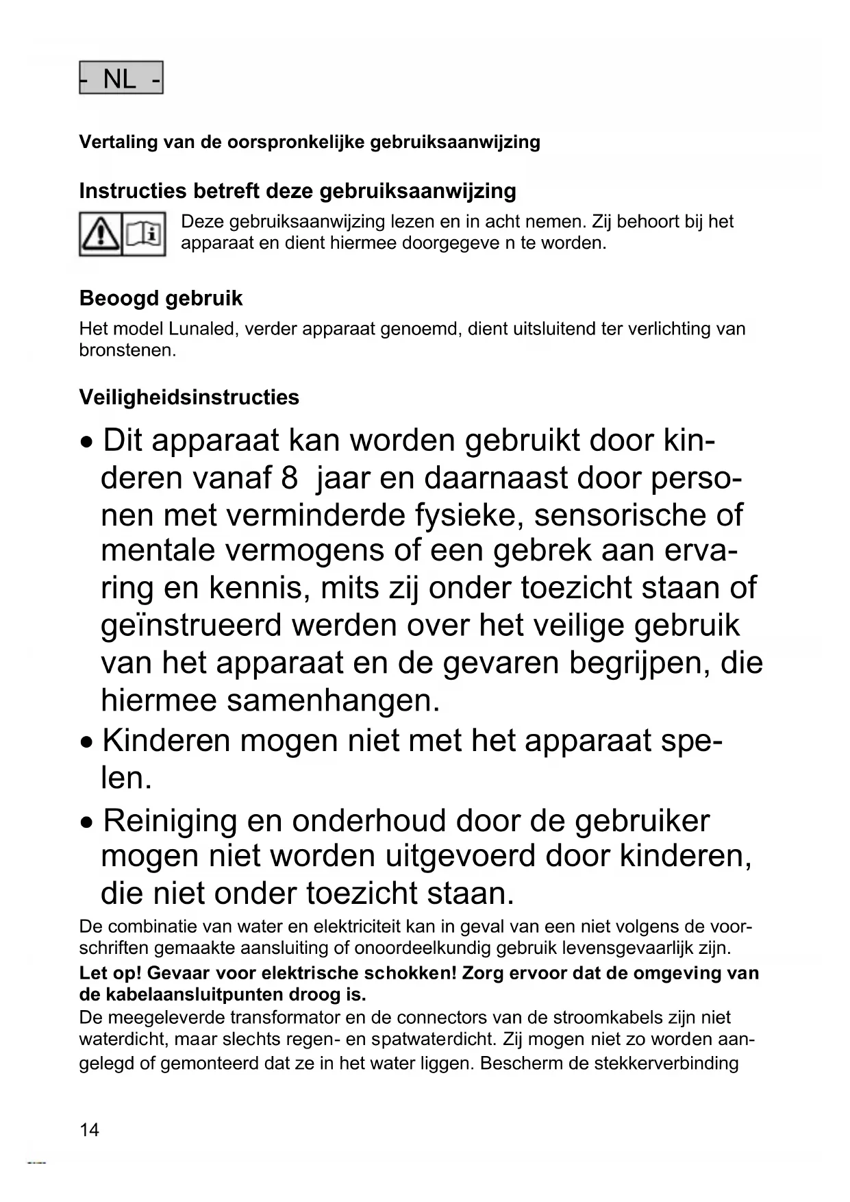 - Reiniging en onderhoud door de gebruiker mogen niet worden uitgevoerd door kinderen, die niet onder toezicht staan. De combinatie van water en elektriciteit kan in geval van een niet volgens de voor- schriften gemaakte aansluiting of onoordeelkundig gebruik levensgevaarlijk zijn. Let op! Gevaar voor elektrische schokken! Zorg ervoor dat de omgeving van de kabelaansluitpunten droog is. De meegeleverde transformator en de connectors van de stroomkabels zijn niet waterdicht, maar slechts regen- en spatwaterdicht. Zij mogen niet zo worden aan- gelegd of gemonteerd dat ze in het water liggen. Bescherm de stekkerverbinding- NL -