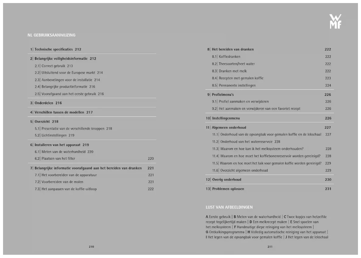 TR SV RU RO PT PL NO NL FI DA CS IT ES FR EN DENL GEBRUIKSAANWIJZING 1|Technische specificaties 212 2|Belangrijke veiligheidsinformatie 212 2.1|Correct gebruik 213 2.2|Uitsluitend voor de Europese markt 214 2.3|Aanbevelingen voor de installatie 214 2.4|Belangrijke productinformatie 216 2.5|Voorafgaand aan het eerste gebruik 216 3|Onderdelen 216 4|Verschillen tussen de modellen 217 5|Overzicht 218 5.1|Presentatie van de verschillende knoppen 218 5.2|Lichtinstellingen 219 6|Installeren van het apparaat 219 6.1|Meten van de waterhardheid 220 6.2|Plaatsen van het filter 220 7|Belangrijke informatie voorafgaand aan het bereiden van dranken 221 7.1|Het voorbereiden van de apparatuur 221 7.2|Voorbereiden van de molen 221 7.3|Het aanpassen van de koffie-uitloop 222 8|Het bereiden van dranken 222 8.1|Koffiedranken 222 8.2|Theesoorten/heet water 222 8.3|Dranken met melk 222 8.4|Recepten met gemalen koffie 223 8.5|Permanente instellingen 224 9|Profielmenu’s 226 9.1|Profiel aanmaken en verwijderen 226 9.2|Het aanmaken en verwijderen van een favoriet recept 226 10|Instellingenmenu 226 11|Algemeen onderhoud 227 11.1|Onderhoud van de opvangbak voor gemalen koffie en de lekschaal 227 11.2|Onderhoud van het waterreservoir 228 11.3|Waarom en hoe kan ik het melksysteem onderhouden? 228 11.4|Waarom en hoe moet het koffiebonenreservoir worden gereinigd? 228 11.5|Waarom en hoe moet het luik voor gemalen koffie worden gereinigd?
