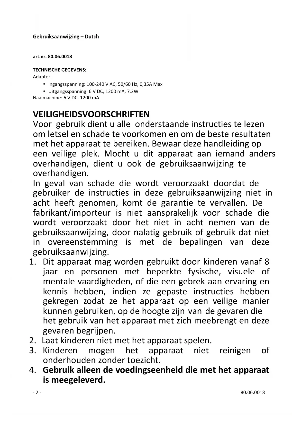 Inhoud – Teneur – Content – Inhalt – Contenido Gebruiksaanwijzing – Dutch ....................................................................................... - 2 - Mode d’emploi – French .......................................................................................... - 15 - Instruction manual – English .................................................................................... - 27 - Bedienungsanleitung – German ............................................................................... - 39 - Manual de Instrucciones – Spanish .......................................................................... - 52 -- 2 - 80.06.0018 Gebruiksaanwijzing – Dutch art.nr. 80.06.0018 TECHNISCHE GEGEVENS: Adapter: Ingangsspanning: 100-240 V AC, 50/60 Hz, 0,35A Max Uitgangsspanning: 6 V DC, 1200 mA, 7.2W Naaimachine: 6 V DC, 1200 mA VEILIGHEIDSVOORSCHRIFTEN Voor gebruik dient u alle onderstaande instructies te lezen om letsel en schade te voorkomen en om de beste resultaten met het apparaat te bereiken. Bewaar deze handleiding op een veilige plek. Mocht u dit apparaat aan iemand anders overhandigen, dient u ook de gebruiksaanwijzing te overhandigen. In geval van schade die wordt veroorzaakt doordat de gebruiker de instructies in deze gebruiksaanwijzing niet in acht heeft genomen, komt de garantie te vervallen. De fabrikant/importeur is niet aansprakelijk voor schade die wordt veroorzaakt door het niet in acht nemen van de gebruiksaanwijzing, door nalatig gebruik of gebruik dat niet in overeenstemming is met de bepalingen van deze gebruiksaanwijzing.