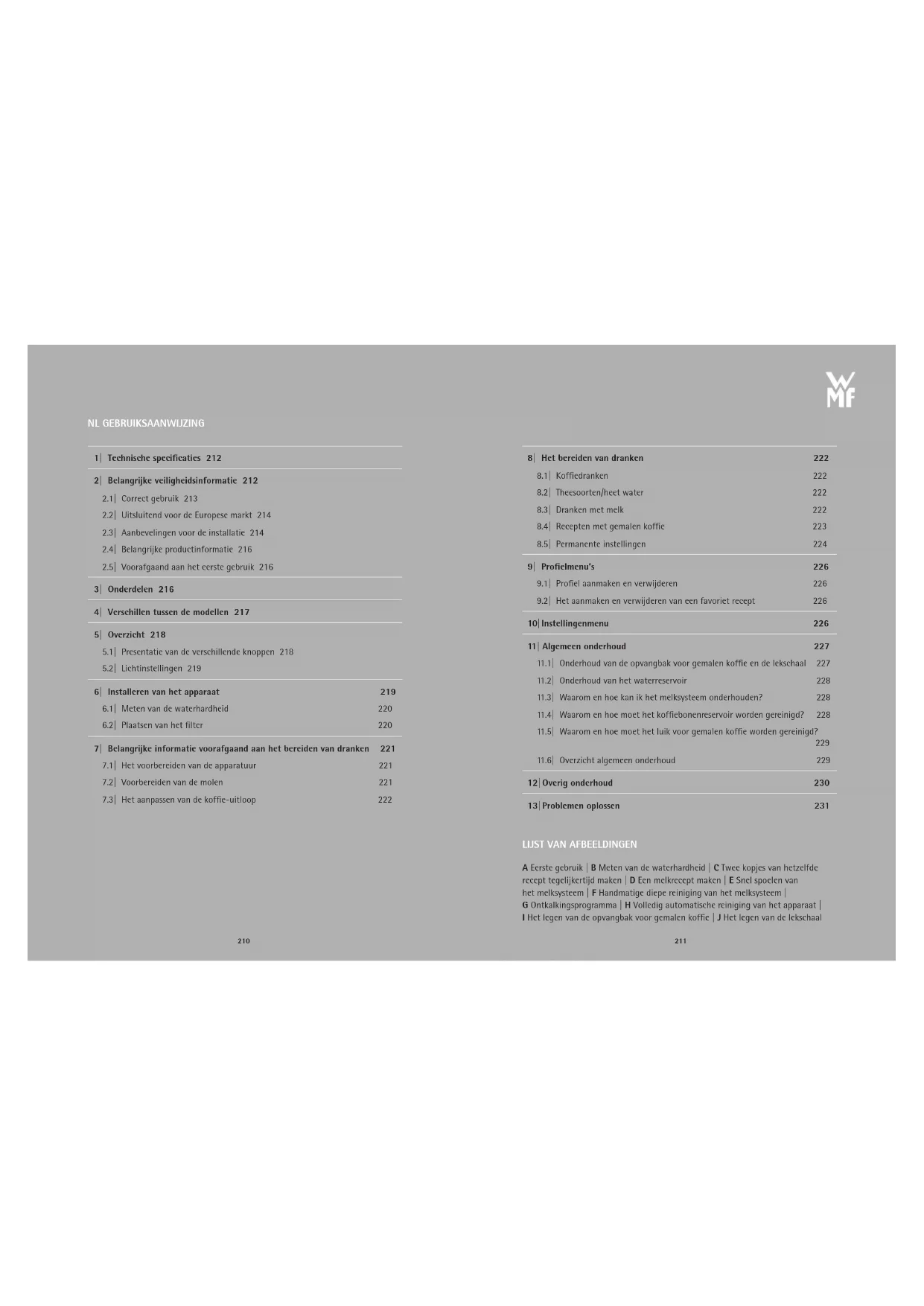 A Eerste gebruik | B Meten van de waterhardheid | C Twee kopjes van hetzelfde recept tegelijkertijd maken | D Een melkrecept maken | E Snel spoelen van het melksysteem | F Handmatige diepe reiniging van het melksysteem | GOntkalkingsprogramma | H Volledig automatische reiniging van het apparaat | IHet legen van de opvangbak voor gemalen koffie | J Het legen van de lekschaal