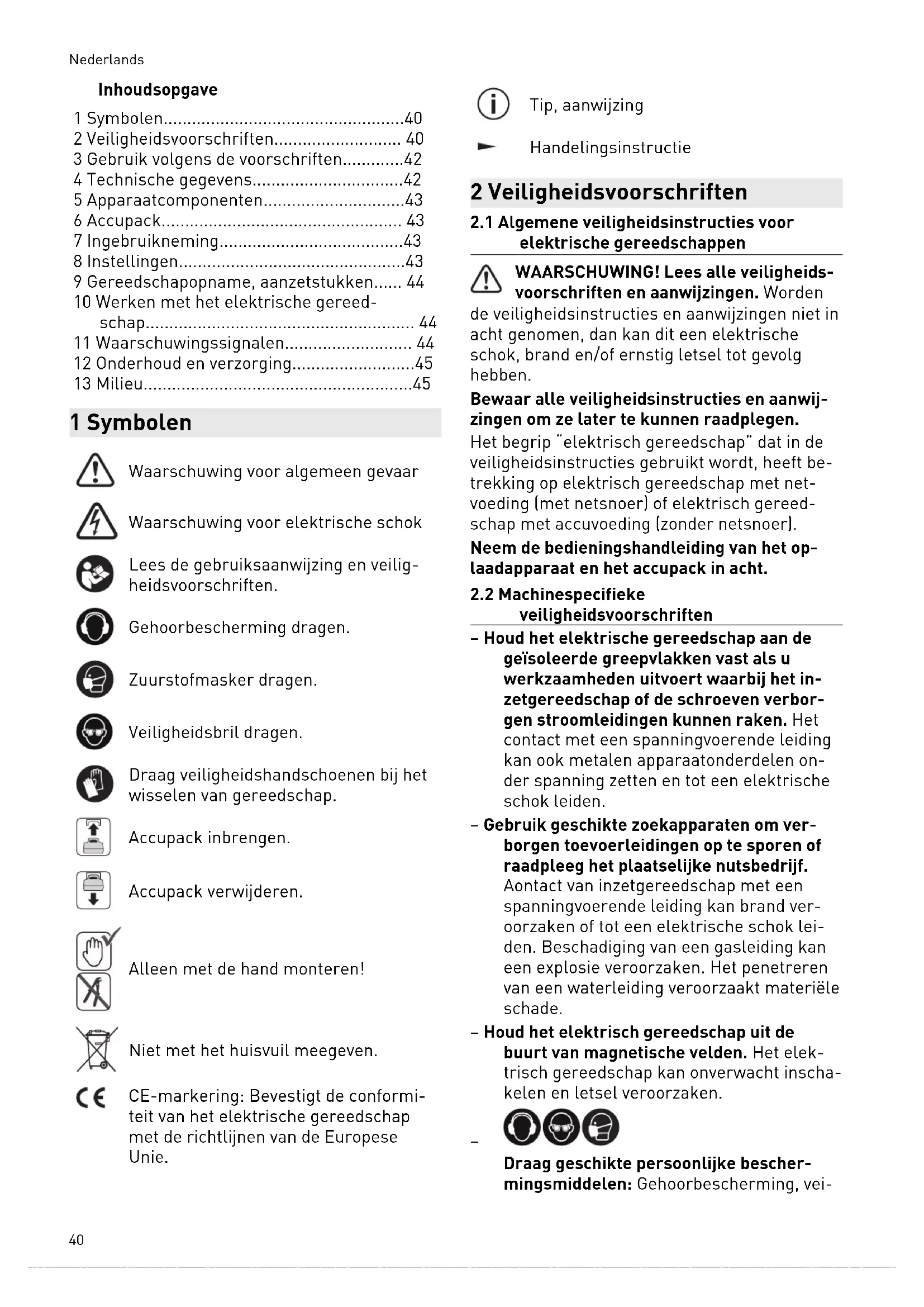 - 13 Miljö 1 Symboler Varning för allmän risk Varning för elstötar Läs bruksanvisningen och säkerhets anvisningarna. Använd hörselskydd. Använd andningsskydd. Använd skyddsglasögon. Använd skyddshandskar vid verktygs byte! Sätt i batteriet. Ta bort batteriet. Montera endast för hand! Kasta den inte i hushållssoporna. CE-märkning: Bekräftar att elverktyget uppfyller kraven i Europeiska gemens kapens direktiv. Tips, information Bruksanvisning 2 Säkerhetsanvisningar p. 51