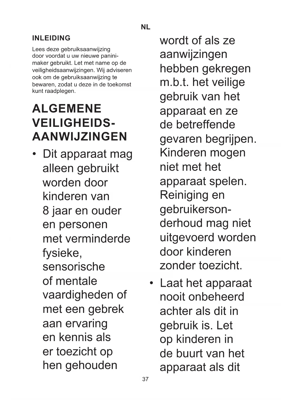 INLEIDING Lees deze gebruiksaanwijzing door voordat u uw nieuwe panini- maker gebruikt. Let met name op de veiligheidsaanwijzingen. Wij adviseren ook om de gebruiksaanwijzing te bewaren, zodat u deze in de toekomst kunt raadplegen. ALGEMENE VEILIGHEIDS- AANWIJZINGEN