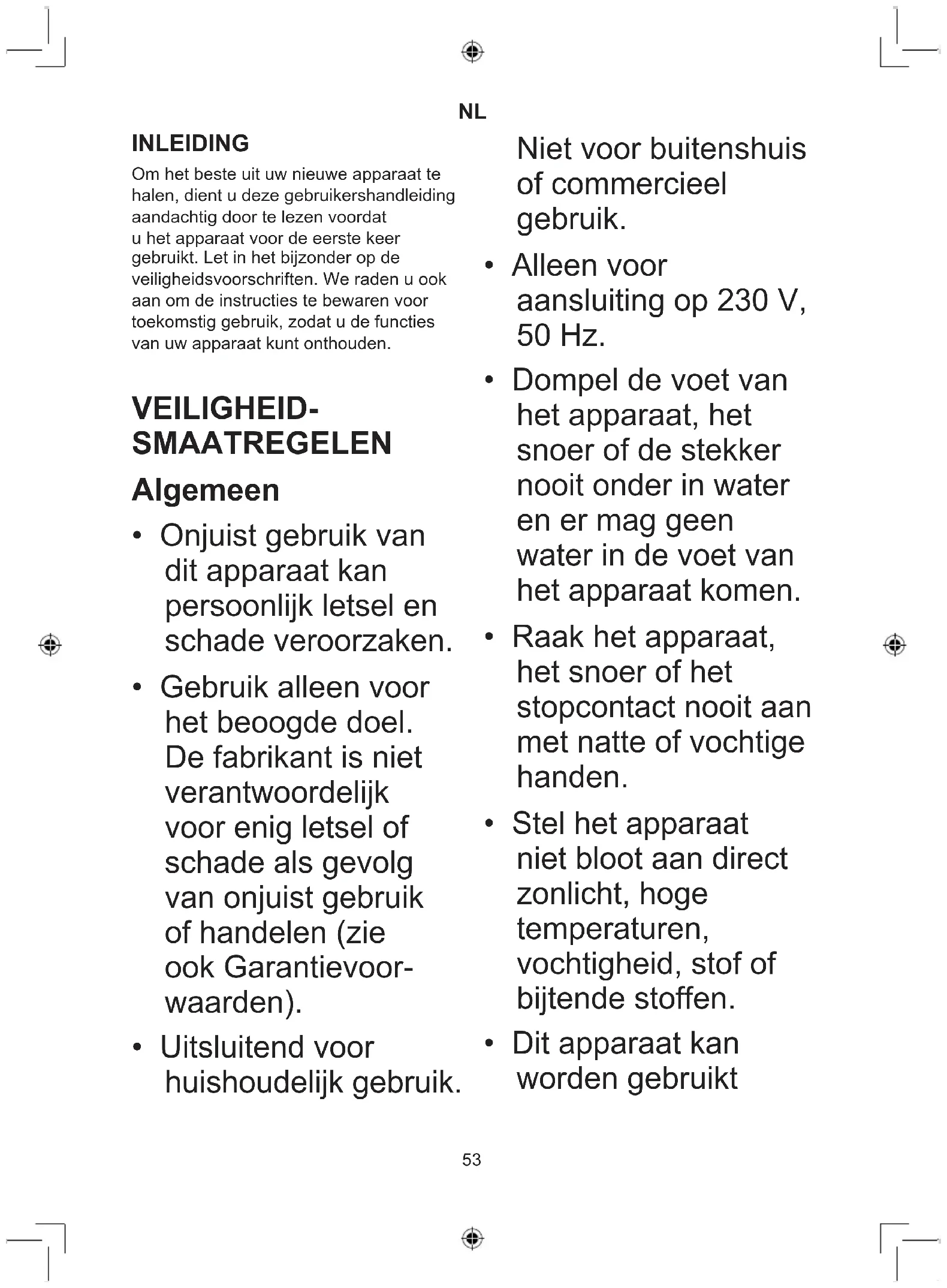 INLEIDING Om het beste uit uw nieuwe apparaat te halen, dient u deze gebruikershandleiding aandachtig door te lezen voordat u het apparaat voor de eerste keer gebruikt. Let in het bijzonder op de veiligheidsvoorschriften. We raden u ook aan om de instructies te bewaren voor toekomstig gebruik, zodat u de functies van uw apparaat kunt onthouden. VEILIGHEID- SMAATREGELEN Algemeen