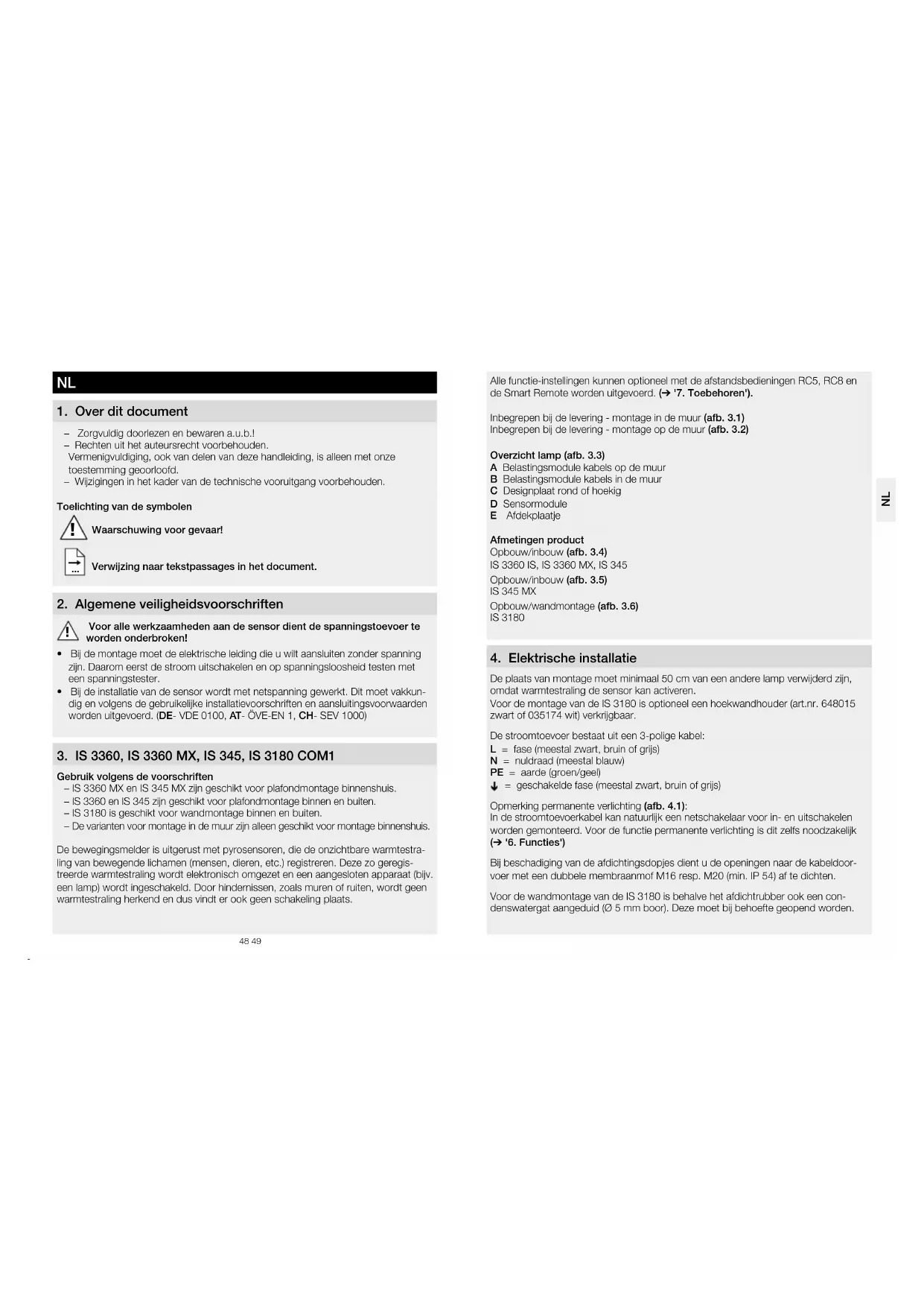 Alle functie-instellingen kunnen optioneel met de afstandsbedieningen RC5, RC8 en de Smart Remote worden uitgevoerd. (➔'7 Toebehoren')Inbegrepen bij de levering - montage in de muur (afb 31)Inbegrepen bij de levering - montage op de muur (afb 32)Overzicht lamp (afb 33)A Belastingsmodule kabels op de muurB Belastingsmodule kabels in de muurC Designplaat rond of hoekigD SensormoduleE AfdekplaatjeAfmetingen product Opbouw/inbouw (afb 34)IS 3360 IS, IS3360 MX, IS345Opbouw/inbouw (afb 35)IS345 MXOpbouw/wandmontage (afb 36)IS 3180 4 Elektrische installatie De plaats van montage moet minimaal 50cm van een andere lamp verwijderd zijn, omdat warmtestraling de sensor kan activeren.Voor de montage van de IS 3180 is optioneel een hoekwandhouder (art.nr. 648015 zwart of 035174 wit) verkrijgbaar.De stroomtoevoer bestaat uit een 3-polige kabel:L = fase (meestal zwart, bruin of grijs)N = nuldraad (meestal blauw)PE = aarde (groen/geel) = geschakelde fase (meestal zwart, bruin of grijs)Opmerking permanente verlichting (afb 41): In de stroomtoevoerkabel kan natuurlijk een netschakelaar voor in- en uitschakelen worden gemonteerd. Voor de functie permanente verlichting is dit zelfs noodzakelijk (➔ '6 Functies')Bij beschadiging van de afdichtingsdopjes dient u de openingen naar de kabeldoor-voer met een dubbele membraanmof M16 resp. M20 (min. IP 54) af te dichten.Voor de wandmontage van de IS3180 is behalve het afdichtrubber ook een con-denswatergat aangeduid (Ø 5mm boor). Deze moet bij behoefte geopend worden. NL50 51 Aansluitvoorbeelden (afb 42) a Lamp zonder aanwezige nuldraad b Lamp met aanwezige nuldraad c Aansluiting via serieschakelaar voor handmatige schakeling en automatische werking d Aansluiting via een wisselschakelaar voor permanente verlichting en automatisch gebruik Stand I: automatische werking Stand II: handmodus voor permanente verlichting Opgelet: uitschakelen van de installatie is niet mogelijk, alleen de keuze tussen stand I en II. a) Aangesloten apparatuur, verlichting max. 2000 W (zie Technische gegevens) b) Aansluitklemmen van de sensor c) Schakelaar binnenshuis d) Serieschakelaar binnenshuis, hand, automatisch e) Wisselschakelaar binnenshuis, automatisch, permanente verlichting Parallelschakeling van meerdere sensoren (niet afgebeeld) Hierbij moet erop gelet worden dat het maximale aansluitvermogen van een sensor niet mag worden overschreden. Bovendien moeten alle apparaten aan dezelfde fase worden aangesloten. Er kunnen max. 10 sensoren parallel worden geschakeld. Opmerking: de kabellengte tussen twee sensoren mag max. 50m bedragen. 5 Montage