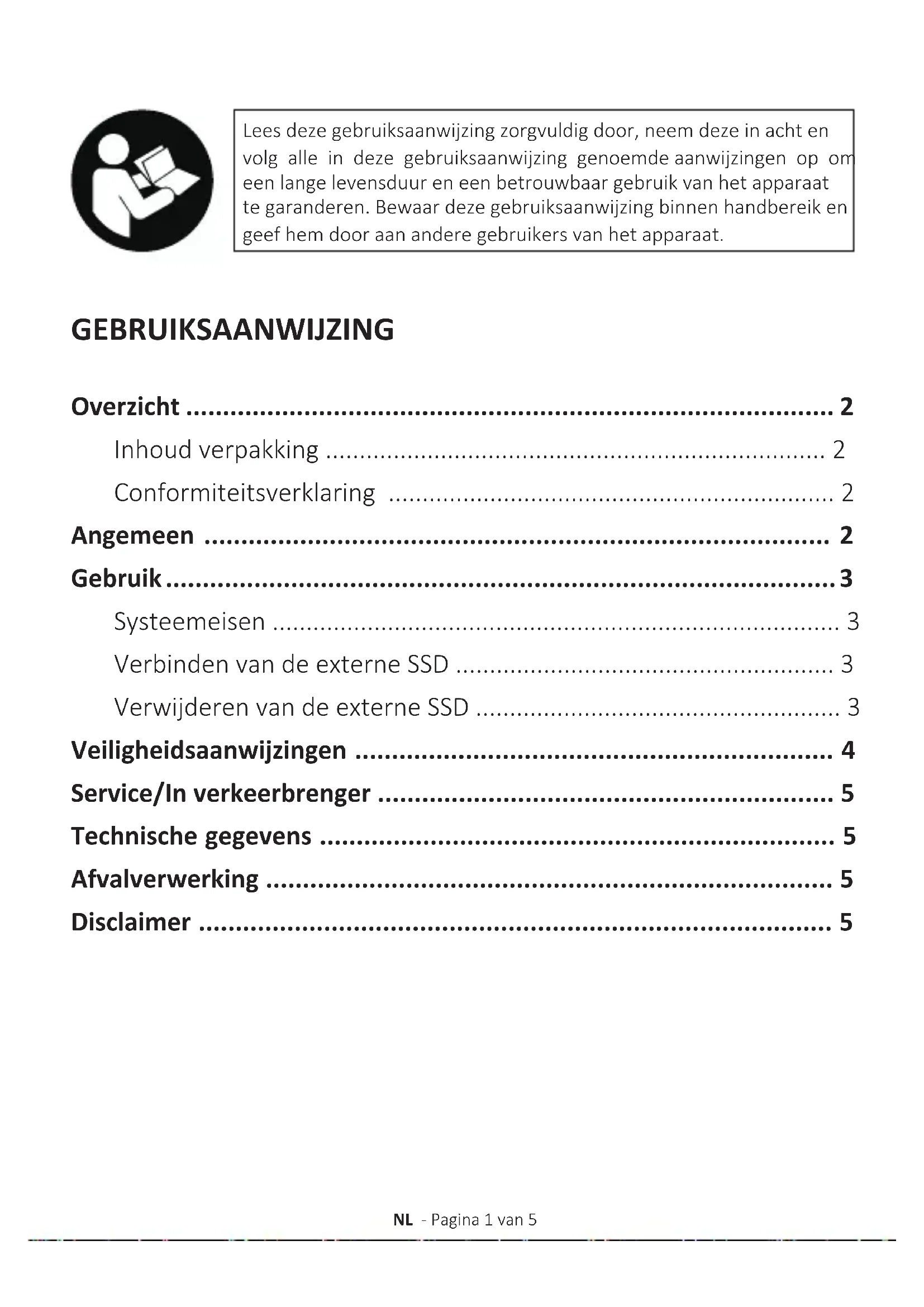 - Le micrologiciel et/ou le matériel peut être modié à tout moment sans préavis. Pour cee raison, il est possible que certaines pares du présent mode d‘emploi, caractérisques techniques et illustraons gurant dans la présente documentaon dièrent légèrement du produit dont vous disposez. L‘ensemble des produits décrits dans le présent mode d‘emploi sert uniquement à des ns d‘illustraon et ne corre- spond pas nécessairement à une situaon spécique. Tout recours découlant du présent mode d‘emploi est exclu. Éliminaon d‘appareils électriques usagés : Les appareils portant ce symbole sont soumis à la direcve européenne 2012/19/CE. Tous les appareils électriques et appareils électriques usagés doivent être éliminés sé- parément des ordures ménagères via les points de collecte prévus par l‘État. Une élimi- naon des appareils électriques usagés dans les règles évite les dommages écologiques. Emballage : Les emballages sont des maères premières. Le matériel d‘emballage de ce produit est adapté au recyclage et peut être réulisé. Veuillez observer les réglementaons locales en vigueur en maère de recyclage lors de l‘éliminaon de tout matériel. DISQUE DUR SSD EXTERNE 3.2 Gen 2x1 Dimensions : 94 x 54 x 10,5 mm Température de fonconnement : entre 5°C et 40°C Débit de transfert : max. 10 GO/sec (USB 3.2 Gen.2x1) Calcul des capacités : 1 MO = 1,000,000 octets 1 GO = 1,000,000,000 octets FR - Page 5 sur 5Lees deze gebruiksaanwijzing zorgvuldig door, neem deze in acht en volg alle in deze gebruiksaanwijzing genoemde aanwijzingen op om een lange levensduur en een betrouwbaar gebruik van het apparaat te garanderen. Bewaar deze gebruiksaanwijzing binnen handbereik en geef hem door aan andere gebruikers van het apparaat. GEBRUIKSAANWIJZING Overzicht p. 2