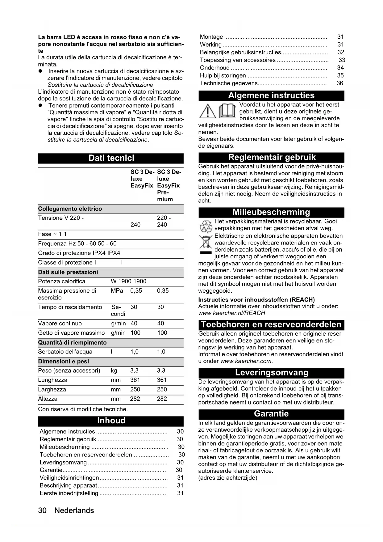 La durata utile della cartuccia di decalcificazione è ter- minata. Inserire la nuova cartuccia di decalcificazione e az- zerare l'indicatore di manutenzione, vedere capitolo Sostituire la cartuccia di decalcificazione. L'indicatore di manutenzione non è stato reimpostato dopo la sostituzione della cartuccia di decalcificazione. Tenere premuti contemporaneamente i pulsanti "Quantità massima di vapore" e "Quantità ridotta di vapore" finché la spia di controllo "Sostituire cartuc- cia di decalcificazione" si spegne, dopo aver inserito la cartuccia di decalcificazione, vedere capitolo So- stituire la cartuccia di decalcificazione. Dati tecnici Con riserva di modifiche tecniche. Inhoud Algemene instructies Voordat u het apparaat voor het eerst gebruikt, dient u deze originele ge- bruiksaanwijzing en de meegeleverde veiligheidsinstructies door te lezen en deze in acht te nemen. Bewaar beide documenten voor later gebruik of volgen- de eigenaars. Reglementair gebruik Gebruik het apparaat uitsluitend voor de privé-huishou- ding. Het apparaat is bestemd voor reiniging met stoom en kan worden gebruikt met geschikt toebehoren, zoals beschreven in deze gebruiksaanwijzing. Reinigingsmid- delen zijn niet nodig. Neem de veiligheidsinstructies in acht. Milieubescherming Het verpakkingsmateriaal is recyclebaar. Gooi verpakkingen met het gescheiden afval weg. Elektrische en elektronische apparaten bevatten waardevolle recyclebare materialen en vaak on- derdelen zoals batterijen, accu's of olie, die bij on- juiste omgang of verkeerd weggooien een mogelijk gevaar voor de gezondheid en het milieu kun- nen vormen. Voor een correct gebruik van het apparaat zijn deze onderdelen echter noodzakelijk. Apparaten met dit symbool mogen niet met het huisvuil worden weggegooid. Instructies voor inhoudsstoffen (REACH) Actuele informatie over inhoudsstoffen vindt u onder: www.kaercher.nl/REACH Toebehoren en reserveonderdelen Gebruik alleen origineel toebehoren en originele reser- veonderdelen. Deze garanderen een veilige en sto- ringsvrije werking van het apparaat. Informatie over toebehoren en reserveonderdelen vindt u onder www.kaercher.com. Leveringsomvang De leveringsomvang van het apparaat is op de verpak- king afgebeeld. Controleer de inhoud bij het uitpakken op volledigheid. Bij ontbrekend toebehoren of bij trans- portschade neemt u contact op met uw distributeur. Garantie In elk land gelden de garantievoorwaarden die door on- ze verantwoordelijke verkoopmaatschappij zijn uitgege- ven. Mogelijke storingen aan uw apparaat verhelpen we binnen de garantieperiode gratis, voor zover een mate- riaal- of fabricagefout de oorzaak is. Als u gebruik wilt maken van de garantie, neemt u met uw aankoopbon contact op met uw distributeur of de dichtstbijzijnde ge- autoriseerde klantenservice. (adres zie achterzijde) SC 3 De- luxe EasyFix SC 3 De- luxe EasyFix Pre- mium Collegamento elettrico Tensione V 220 -