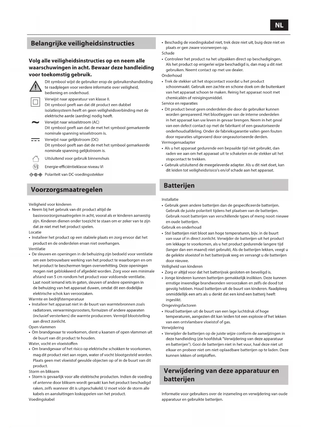 Dit symbool wijst de gebruiker erop de gebruikershandleiding te raadplegen voor verdere informatie over veiligheid, bediening en onderhoud. Verwijst naar apparatuur van klasse II. Dit symbool geeft aan dat dit product een dubbel isolatiesysteem heeft en geen veiligheidsverbinding met de elektrische aarde (aarding) nodig heeft. Verwijst naar wisselstroom (AC) Dit symbool geeft aan dat de met het symbool gemarkeerde nominale spanning wisselstroom is. Verwijst naar gelijkstroom (DC) Dit symbool geeft aan dat de met het symbool gemarkeerde nominale spanning gelijkstroom is. Uitsluitend voor gebruik binnenshuis Energie-eciëntieklasse niveau VI Polariteit van DC-voedingsstekker Voorzorgsmaatregelen Veiligheid voor kinderen