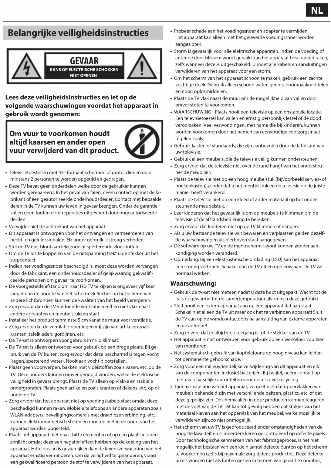 - Televisietoestellen met 43"-formaat schermen of groter dienen door minstens 2 personen te worden opgetild en gedragen.• Deze TV bevat geen onderdelen welke door de gebruiker kunnen worden gerepareerd. In het geval van falen, neem contact op met de fa-brikant of een geautoriseerde onderhoudsdealer. Contact met bepaalde delen in de TV kunnen uw leven in gevaar brengen. Onder de garantie vallen geen fouten door reparaties uitgevoerd door ongeautoriseerde derden.• Verwijder niet de achterkant van het apparaat.• Dit apparaat is ontworpen voor het ontvangen en vermeerderen van beeld- en geluidssignalen. Elk ander gebruik is streng verboden.• Stel de TV niet bloot aan lekkende of spetterende vloeistoen.• Om de TV los te koppelen van de netspanning trekt u de stekker uit het stopcontact.• Indien het voedingssnoer beschadigd is, moet deze worden vervangen door de fabrikant, een onderhoudsdealer of gelijkwaardig gekwali-ceerde personen om gevaar te voorkomen.• De voorgestelde afstand om naar HD TV te kijken is ongeveer vijf keer langer dan de hoogte van het scherm. Reecties op het scherm van andere lichtbronnen kunnen de kwaliteit van het beeld verergeren.• Zorg ervoor dan de TV voldoende ventilatie heeft en niet vlak naast andere apparaten en meubelstukken staat.• Installeer het product tenminste 5 cm vanaf de muur voor ventilatie.• Zorg ervoor dat de ventilatie-openingen vrij zijn van artikelen zoals kranten, tafelkleden, gordijnen, etc.• De TV-set is ontworpen voor gebruik in mild klimaat.• De TV-set is alleen ontworpen voor gebruik op een droge plaats. Bij ge-bruik van de TV buiten, zorg ervoor dat deze beschermd is tegen vocht (regen, spetterend water). Nooit aan vocht blootstellen.• Plaats geen voorwerpen, bakken met vloeistoen zoals vazen, etc. op de TV. Deze houders kunnen omver gegooid worden, welke de elektrische veiligheid in gevaar brengt. Plaats de TV alleen op vlakke en stabiele ondergronden. Plaats geen artikelen zoals kranten of dekens, etc. op of onder de TV.• Zorg ervoor dat het apparaat niet op voedingskabels staat omdat deze beschadigd kunnen raken. Mobiele telefoons an andere apparaten zoals WLAN-adapters, beveiligingscamera’smet draadloze verbinding, etc. kunnen elektromagnetisch storen en moeten niet in de buurt van het apparaat worden opgesteld.• Plaats het apparaat niet naast hitte elementen of op een plaats in direct zonlicht omdat deze een negatief eect hebben op de koeling van het apparaat. Hitte opslag is gevaarlijk en kan de levensverwachting van het apparaat ernstig verminderen. Om de veiligheid te garanderen, vraag een gekwaliceerd persoon de stof te verwijderen van het apparaat.• Probeer schade aan het voedingssnoer en adapter te vermijden. Het apparaat kan alleen met het geleverde voedingssnoer worden aangesloten.• Storm is gevaarlijk voor alle elektrische apparaten. Indien de voeding of antenne door bliksem wordt geraakt kan het apparaat beschadigd raken, zelfs wanneer deze is uitgeschakeld. Umoet alle kabels en aansluitingen verwijderen van het apparaat voor een storm.• Om het scherm van het apparaat schoon te maken, gebruik een zachte vochtige doek. Gebruik alleen schoon water, geen schoonmaakmiddelen en nooit oplosmiddelen.• Plaats de TV vlak naast de muur om de mogelijkheid van vallen door omver stoten te voorkomen.• WAARSCHUWING - Plaats nooit een televisie op een onstabiele locatie. Een televisietoestel kan vallen en ernstig persoonlijk letsel of de dood veroorzaken. Veel verwondingen, met name die bij kinderen, kunnen worden voorkomen door het nemen van eenvoudige voorzorgsmaat-regelen zoals:• Gebruik kasten of standaards, die zijn aanbevolen door de fabrikant van uw televisie.• Gebruik alleen meubels, die de televisie veilig kunnen ondersteunen.• Zorg ervoor dat de televisie niet over de rand hangt van het ondersteu-nende meubilair.• Plaats de televisie niet op een hoog meubelstuk (bijvoorbeeld servies- of boekenkasten) zonder dat u het meubelstuk en de televisie op de juiste manier heeft verankerd.• Plaats de televisie niet op een kleed of ander materiaal op het onder-steunende meubelstuk.• Leer kinderen dat het gevaarlijk is om op meubels te klimmen om de televisie of de afstandsbediening te bereiken.• Zorg ervoor dat kinderen niet op de TV klimmen of hangen.• Als u uw bestaande televisie wilt bewaren en verplaatsen gelden dezelf-de waarschuwingen als hierboven staat aangegeven.• De software op uw TV en de menuscherm-layout kunnen zonder aan-kondiging worden veranderd.• Opmerking: Bij een elektrostatische ontlading (ESD) kan het apparaat een storing vertonen. Schakel dan de TV uit en opnieuw aan. De TV zal normaal werken. Waarschuwing: