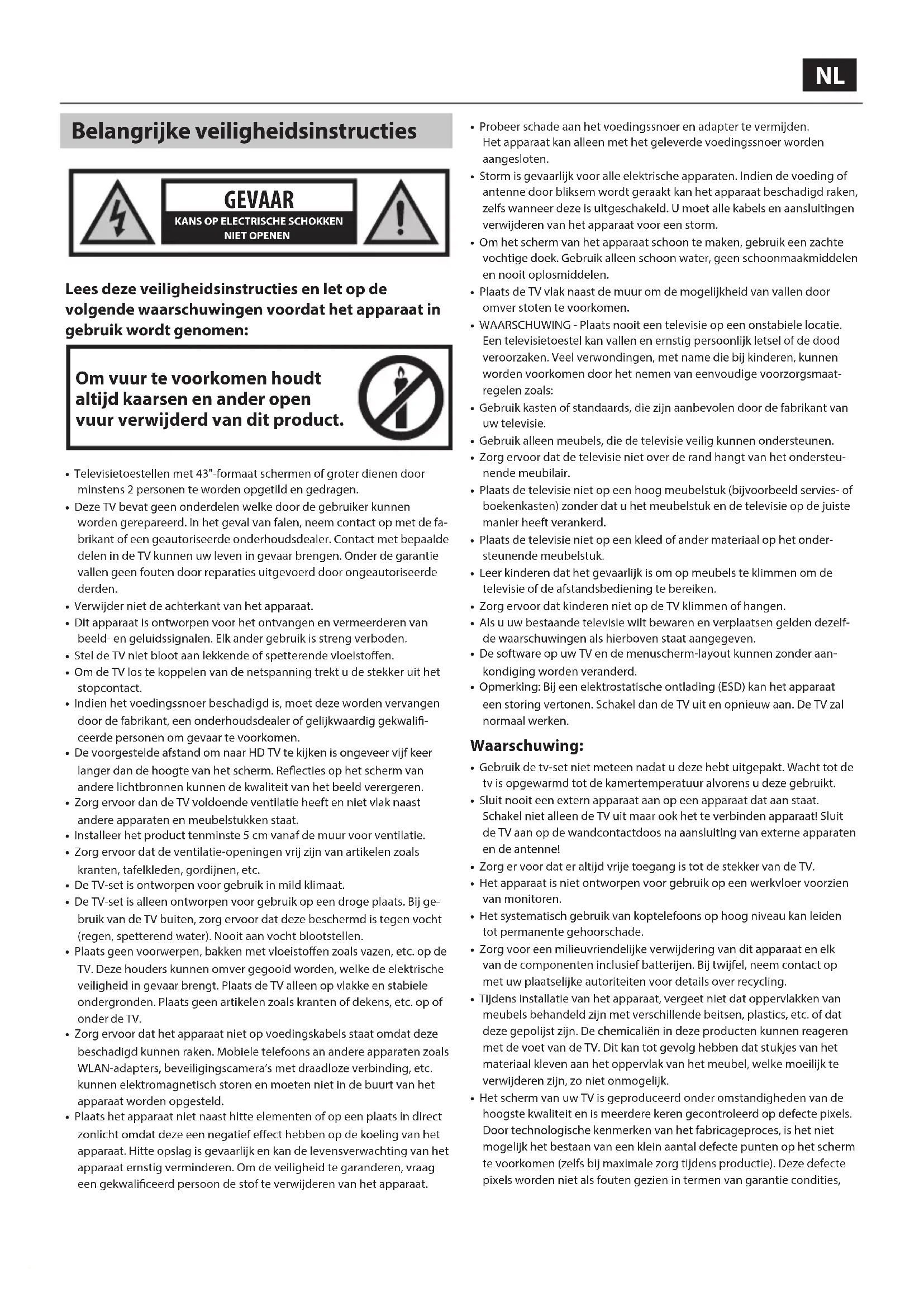 - Televisietoestellen met 43"-formaat schermen of groter dienen door minstens 2 personen te worden opgetild en gedragen.• Deze TV bevat geen onderdelen welke door de gebruiker kunnen worden gerepareerd. In het geval van falen, neem contact op met de fa-brikant of een geautoriseerde onderhoudsdealer. Contact met bepaalde delen in de TV kunnen uw leven in gevaar brengen. Onder de garantie vallen geen fouten door reparaties uitgevoerd door ongeautoriseerde derden.• Verwijder niet de achterkant van het apparaat.• Dit apparaat is ontworpen voor het ontvangen en vermeerderen van beeld- en geluidssignalen. Elk ander gebruik is streng verboden.• Stel de TV niet bloot aan lekkende of spetterende vloeistoen.• Om de TV los te koppelen van de netspanning trekt u de stekker uit het stopcontact.• Indien het voedingssnoer beschadigd is, moet deze worden vervangen door de fabrikant, een onderhoudsdealer of gelijkwaardig gekwali-ceerde personen om gevaar te voorkomen.• De voorgestelde afstand om naar HD TV te kijken is ongeveer vijf keer langer dan de hoogte van het scherm. Reecties op het scherm van andere lichtbronnen kunnen de kwaliteit van het beeld verergeren.• Zorg ervoor dan de TV voldoende ventilatie heeft en niet vlak naast andere apparaten en meubelstukken staat.• Installeer het product tenminste 5 cm vanaf de muur voor ventilatie.• Zorg ervoor dat de ventilatie-openingen vrij zijn van artikelen zoals kranten, tafelkleden, gordijnen, etc.• De TV-set is ontworpen voor gebruik in mild klimaat.• De TV-set is alleen ontworpen voor gebruik op een droge plaats. Bij ge-bruik van de TV buiten, zorg ervoor dat deze beschermd is tegen vocht (regen, spetterend water). Nooit aan vocht blootstellen.• Plaats geen voorwerpen, bakken met vloeistoen zoals vazen, etc. op de TV. Deze houders kunnen omver gegooid worden, welke de elektrische veiligheid in gevaar brengt. Plaats de TV alleen op vlakke en stabiele ondergronden. Plaats geen artikelen zoals kranten of dekens, etc. op of onder de TV.• Zorg ervoor dat het apparaat niet op voedingskabels staat omdat deze beschadigd kunnen raken. Mobiele telefoons an andere apparaten zoals WLAN-adapters, beveiligingscamera’smet draadloze verbinding, etc. kunnen elektromagnetisch storen en moeten niet in de buurt van het apparaat worden opgesteld.• Plaats het apparaat niet naast hitte elementen of op een plaats in direct zonlicht omdat deze een negatief eect hebben op de koeling van het apparaat. Hitte opslag is gevaarlijk en kan de levensverwachting van het apparaat ernstig verminderen. Om de veiligheid te garanderen, vraag een gekwaliceerd persoon de stof te verwijderen van het apparaat.• Probeer schade aan het voedingssnoer en adapter te vermijden. Het apparaat kan alleen met het geleverde voedingssnoer worden aangesloten.• Storm is gevaarlijk voor alle elektrische apparaten. Indien de voeding of antenne door bliksem wordt geraakt kan het apparaat beschadigd raken, zelfs wanneer deze is uitgeschakeld. Umoet alle kabels en aansluitingen verwijderen van het apparaat voor een storm.• Om het scherm van het apparaat schoon te maken, gebruik een zachte vochtige doek. Gebruik alleen schoon water, geen schoonmaakmiddelen en nooit oplosmiddelen.• Plaats de TV vlak naast de muur om de mogelijkheid van vallen door omver stoten te voorkomen.• WAARSCHUWING - Plaats nooit een televisie op een onstabiele locatie. Een televisietoestel kan vallen en ernstig persoonlijk letsel of de dood veroorzaken. Veel verwondingen, met name die bij kinderen, kunnen worden voorkomen door het nemen van eenvoudige voorzorgsmaat-regelen zoals:• Gebruik kasten of standaards, die zijn aanbevolen door de fabrikant van uw televisie.• Gebruik alleen meubels, die de televisie veilig kunnen ondersteunen.• Zorg ervoor dat de televisie niet over de rand hangt van het ondersteu-nende meubilair.• Plaats de televisie niet op een hoog meubelstuk (bijvoorbeeld servies- of boekenkasten) zonder dat u het meubelstuk en de televisie op de juiste manier heeft verankerd.• Plaats de televisie niet op een kleed of ander materiaal op het onder-steunende meubelstuk.• Leer kinderen dat het gevaarlijk is om op meubels te klimmen om de televisie of de afstandsbediening te bereiken.• Zorg ervoor dat kinderen niet op de TV klimmen of hangen.• Als u uw bestaande televisie wilt bewaren en verplaatsen gelden dezelf-de waarschuwingen als hierboven staat aangegeven.• De software op uw TV en de menuscherm-layout kunnen zonder aan-kondiging worden veranderd.• Opmerking: Bij een elektrostatische ontlading (ESD) kan het apparaat een storing vertonen. Schakel dan de TV uit en opnieuw aan. De TV zal normaal werken. Waarschuwing: