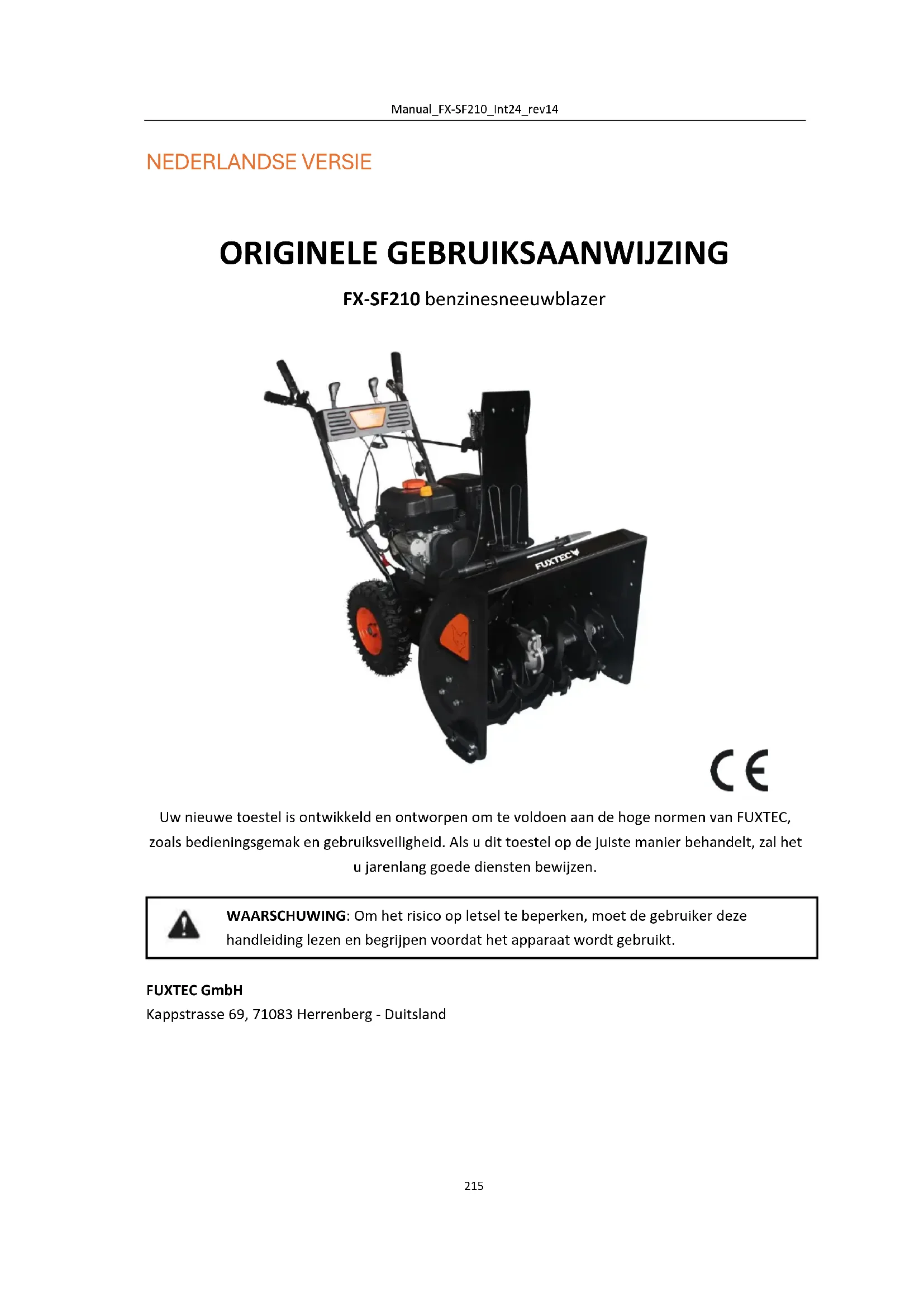 Uw nieuwe toestel is ontwikkeld en ontworpen om te voldoen aan de hoge normen van FUXTEC, zoals bedieningsgemak en gebruiksveiligheid. Als u dit toestel op de juiste manier behandelt, zal het u jarenlang goede diensten bewijzen. WAARSCHUWING: Om het risico op letsel te beperken, moet de gebruiker deze handleiding lezen en begrijpen voordat het apparaat wordt gebruikt. FUXTEC GmbH Kappstrasse 69, 71083 Herrenberg - DuitslandManual_FX-SF210_Int24_rev14