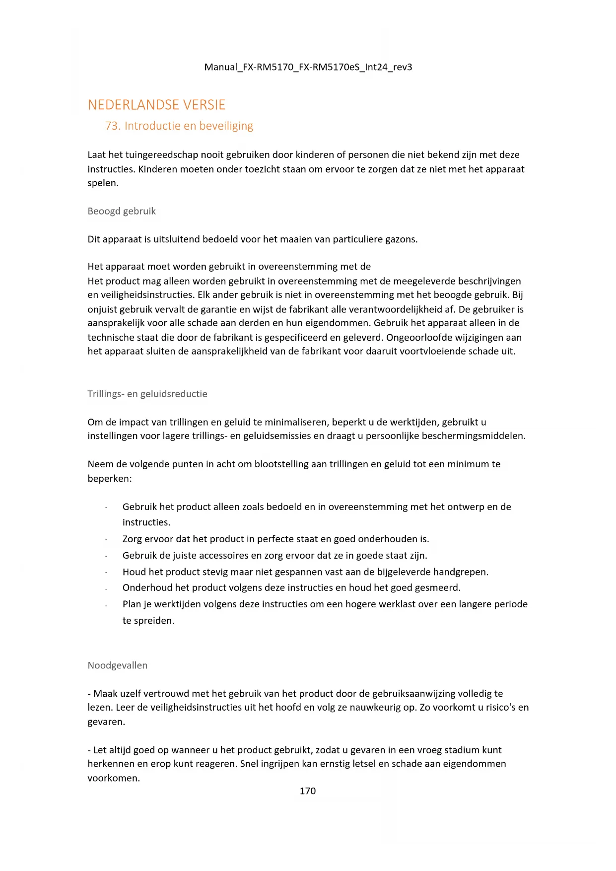 Algemene veiligheidsinstructies - Lees voor uw eigen veiligheid en die van anderen deze gebruiksaanwijzing en de bijbehorende veiligheidsvoorschriften voordat u het apparaat gebruikt. Bewaar de gebruiksaanwijzing en de veiligheidsinstructies voor later gebruik en bewaar ze voor toekomstig gebruik. bij de hand voor elk gebruik. - Geef de gebruiksaanwijzing samen met het apparaat door als het in andere handen overgaat. - Personen die het apparaat bedienen mogen niet onder invloed zijn van bedwelmende middelen (bijv. alcohol, drugs of medicijnen). - Gebruik het apparaat alleen in de door de fabrikant voorgeschreven en geleverde bedrijfsmodus. technische voorwaarde. Ongeoorloofde wijzigingen aan het apparaat sluiten de aansprakelijkheid van de fabrikant voor daaruit voortvloeiende schade uit. - Gebruik het apparaat alleen bij daglicht of goed kunstlicht. - Gebruik het apparaat alleen bij droog weer. Houd het uit de buurt van regen of natte omstandigheden. Als er water in het apparaat komt, neemt het risico op elektrische schokken toe. - Schakel het apparaat uit en verwijder de batterij onder de volgende omstandigheden: ⬧ als het apparaat onbeheerd wordt achtergelaten; ⬧ als het apparaat overmatig begint te trillen. Voor gebruik - Maak uzelf vertrouwd met het apparaat en de functies en bedieningselementen voordat u met de werkzaamheden begint. - Controleer het apparaat op tekenen van slijtage of schade voor ingebruikname en na een botsing. - Gebruik geen apparaten waarvan de schakelaar defect is en niet meer kan worden in- of uitgeschakeld.Manual_FX-RM5170_FX-RM5170eS_Int24_rev3