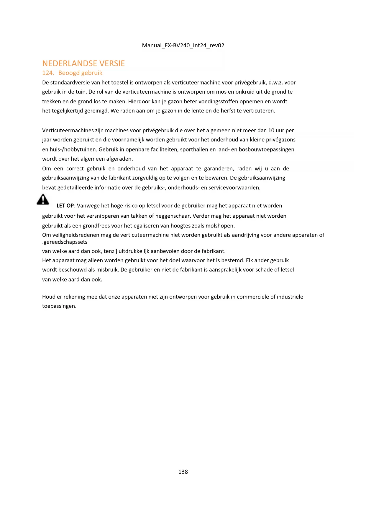De standaardversie van het toestel is ontworpen als verticuteermachine voor privégebruik, d.w.z. voor gebruik in de tuin. De rol van de verticuteermachine is ontworpen om mos en onkruid uit de grond te trekken en de grond los te maken. Hierdoor kan je gazon beter voedingsstoffen opnemen en wordt het tegelijkertijd gereinigd. We raden aan om je gazon in de lente en de herfst te verticuteren. Verticuteermachines zijn machines voor privégebruik die over het algemeen niet meer dan 10 uur per jaar worden gebruikt en die voornamelijk worden gebruikt voor het onderhoud van kleine privégazons en huis-/hobbytuinen. Gebruik in openbare faciliteiten, sporthallen en land- en bosbouwtoepassingen wordt over het algemeen afgeraden. Om een correct gebruik en onderhoud van het apparaat te garanderen, raden wij u aan de gebruiksaanwijzing van de fabrikant zorgvuldig op te volgen en te bewaren. De gebruiksaanwijzing bevat gedetailleerde informatie over de gebruiks-, onderhouds- en servicevoorwaarden. LET OP: Vanwege het hoge risico op letsel voor de gebruiker mag het apparaat niet worden gebruikt voor het versnipperen van takken of heggenschaar. Verder mag het apparaat niet worden gebruikt als een grondfrees voor het egaliseren van hoogtes zoals molshopen. Om veiligheidsredenen mag de verticuteermachine niet worden gebruikt als aandrijving voor andere apparaten of .gereedschapssets van welke aard dan ook, tenzij uitdrukkelijk aanbevolen door de fabrikant. Het apparaat mag alleen worden gebruikt voor het doel waarvoor het is bestemd. Elk ander gebruik wordt beschouwd als misbruik. De gebruiker en niet de fabrikant is aansprakelijk voor schade of letsel van welke aard dan ook. Houd er rekening mee dat onze apparaten niet zijn ontworpen voor gebruik in commerciële of industriële toepassingen.Manual_FX-BV240_Int24_rev02