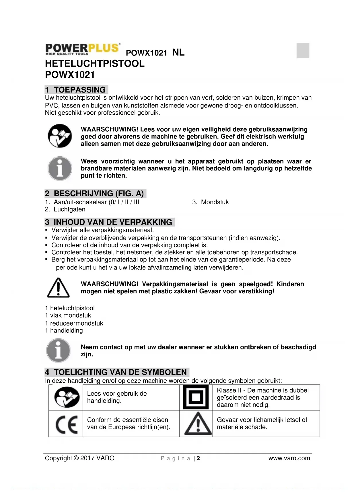 U apparaat heeft geen extra smering nodig. 10 TECHNISCHE GEGEVENS Spanning 230-240 V – 50 Hz Opgenomen vermogen 2000 W Luchttemperatuur 50-580 °C Luchtstroom 300-500 l/min 11 GARANTIE Dit product is gewaarborgd gedurende een periode van 36 maanden die begint vanaf de datum van aankoop door de eerste koper. Deze garantie dekt alle materiaal- of productiefouten met uitsluiting van: batterijen, laders, defecten aan onderdelen onderhevig aan normale slijtage zoals lagers, borstels, kabels, stekkers of accessoires zoals boren, boorbits, zaagbladen enz., beschadigingen of defecten die voortvloeien uit onjuist gebruik, ongelukken of modificaties, alsook de transportkosten. Vallen ook niet onder de garantiebepalingen: beschadigingen en/of defecten die voortvloeien uit onjuist gebruik. Wij wijzen tevens alle verantwoordelijkheid af voor elk lichamelijk letsel welke het gevolg is van onjuist gebruik van het toestel. Herstellingen mogen enkel gebeuren door een erkende klantenservice voor Powerplus gereedschappen. Meer informatie kan u steeds bekomen op het nummer 00 32 3 292 92 90. Eventuele transportkosten zijn steeds voor rekening van de klant, tenzij schriftelijk anders overeengekomen werd. Tevens kan geen aanspraak gemaakt worden op de garantie wanneer de schade aan het toestel het gevolg is van nalatig onderhoud of overbelasting. Zeker uitgesloten van de garantie is schade als gevolg van vochtinsijpeling, overmatige stofindringing, moedwillige beschadiging (met opzet of door grove onachtzaamheid), ondoelmatig gebruik (gebruik voor doeleinden waarvoor het toestel niet geschikt is), onoordeelkundig gebruik (o.a. niet respecteren van de instructies gegeven in de handleiding), ondeskundige montage, blikseminslag, verkeerde netspanning. Deze lijst is niet limitatief. De aanvaarding van claims onder garantie geeft in géén geval aanleiding tot verlenging van de garantieperiode noch tot het aanvangen van een nieuwe garantieperiode in geval van een vervanging van het toestel. Toestellen of onderdelen die onder waarborg vervangen werden, worden daardoor eigendom van Varo NV. We behouden ons het recht voor om elke garantieclaim te weigeren waarbij de aankoop niet kan worden geverifieerd of waarbij het duidelijk is dat het product niet correct werd onderhouden (propere ventilatiesleuven, regelmatig vervangen koolborstels, ...). Uw aankoopbon moet worden bewaard als bewijs van de aankoopdatum. Uw gereedschap moet als geheel naar uw dealer worden teruggebracht in een aanvaardbare staat van netheid, in zijn originele kunststof koffer (indien van toepassing op het product) en het moet vergezeld zijn van uw bewijs van aankoop.POWX1021 NL Copyright © 2017 VARO P a g i n a | 9 www.varo.com 12 MILIEU Als uw machine na verloop van tijd aan vervanging toe is, geef het dan niet met het huisvuil mee, maar zorg voor een milieuvriendelijke verwerking. Afval geproduceerd door elektrische machines mag niet behandeld worden als normaal huishoudelijk afval. Zorg voor recycling daar waar passende installaties bestaan. Raadpleeg de plaatselijke instanties of de verkoper voor adviezen over inzameling en verwerking.POWX1021 FR Copyright © 2017 VARO P a g e | 1 www.varo.com 1 UTILISATION ................................................................................... 2