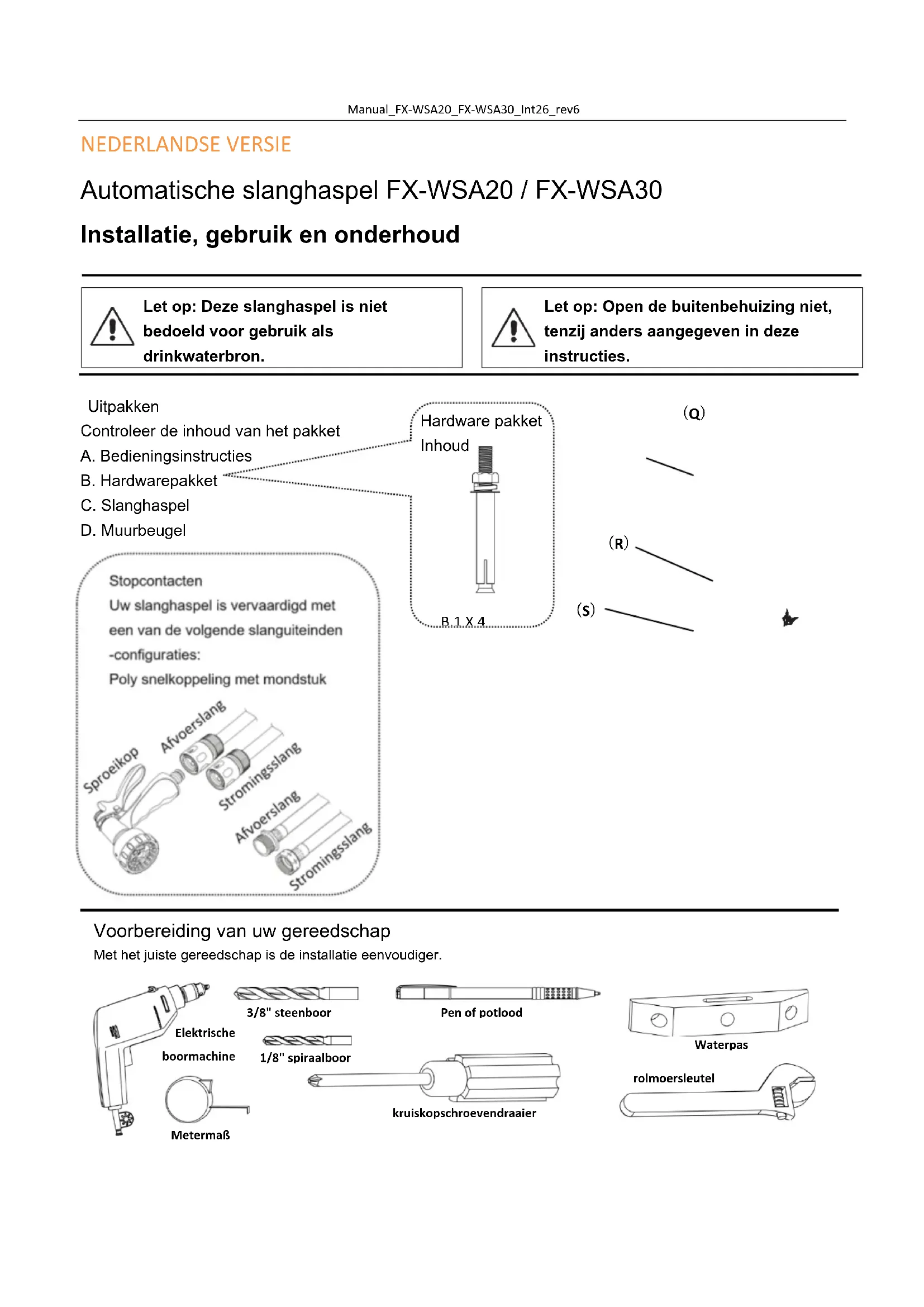 1/8" spiraalboor NEDERLANDSE VERSIE Automatische slanghaspel FX-WSA20 / FX-WSA30 Installatie, gebruik en onderhoud