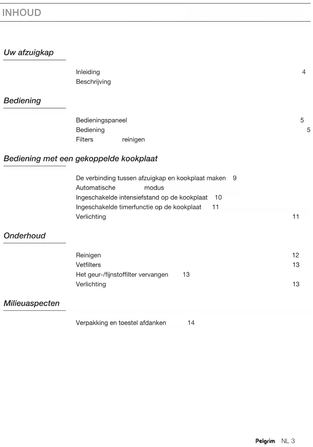 Instructions for use 3 - 14 Gebruikte pictogrammen / Pictogrammes utilisés Verwendete Piktogramme / Pictograms used Belangrijke informatie / Important à savoir / Wichtiger Hinweis / Important information Handig om te weten / Bon à savoir / Tipp / Nice to knowNL 3 INHOUD Uw afzuigkap Inleiding 4 Beschrijving 4 Bediening Bedieningspaneel 5 Bediening 5 Filters reinigen 8 Bediening met een gekoppelde kookplaat De verbinding tussen afzuigkap en kookplaat maken 9 Automatische modus 10 Ingeschakelde intensiefstand op de kookplaat 10 Ingeschakelde timerfunctie op de kookplaat 11 Verlichting 11 Onderhoud Reinigen 12 Vetfilters 13 Het geur-/fijnstoffilter vervangen 13 Verlichting 13 Milieuaspecten Verpakking en toestel afdanken 14NL 4 Inleiding Gefeliciteerd met uw keuze voor deze afzuigkap van Pelgrim. In het ontwerp van dit product heeft eenvoudige bediening en optimale gebruiksvriendelijkheid centraal gestaan. Deze afzuigkap beschikt over AutoAir functionaliteit. Via een kookplaat met AutoAir functie kan de afzuiging op 3 verschillende manieren aangestuurd worden; handmatig, semi-automatisch en volledig automatisch. Kies de manier die het beste bij u past. Uiteraard is er altijd de mogelijkheid om de instellingen zelf aan te passen. In deze handleiding leest u hoe u dit toestel het best kunt gebruiken. Naast informatie over de bediening, vindt u hier ook achtergrondinformatie die u tijdens het gebruik van het toestel van pas kan komen. Lees eerst de separate veiligheidsinstructies voordat u het toestel gebruikt. Lees deze handleiding door voordat u het toestel in gebruik neemt, en berg de handleiding daarna veilig op voor toekomstig gebruik. Op onze website kunt u de meest recente versie van de gebruiksaanwijzing vinden. UW AFZUIGKAPNL 5 BEDIENING Bedieningspaneel De extra AutoAir functies die beschikbaar zijn als er een verbinding is gemaakt met een kookplaat, worden in een apart hoofdstuk beschreven (zie ‘Bediening met een gekoppelde kookplaat’).