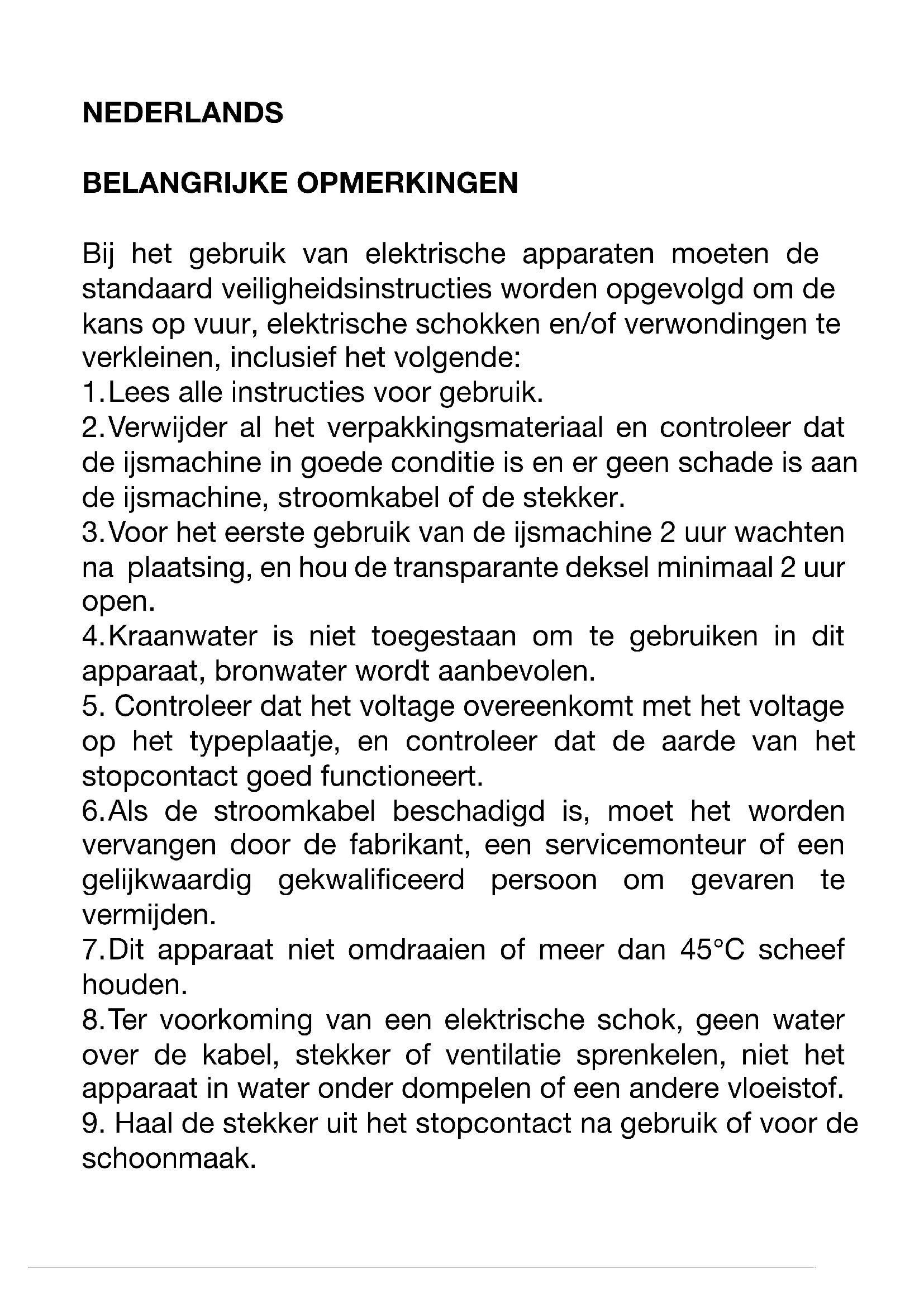 voer het apparaat daarom in bij een milieustraat. Niet blootstellen aan vuur. Dit symbool geeft aan dat het koelmiddel R600a en de materialen die niet van metaal zijn in het apparaat ontbrandbaar zijn. Het is een waarschuwingsteken. Waarschuwing: Risico op brand / brandbare materialen. Waarschuwing; Risico op brand / brandbare materialen. WAARSCHUWING: Als u het apparaat plaatst dient u te zorgen dat de stroomkabel nergens klemt of beschadigd is. WAARSCHUWING: Plaats geen verdeelstekkers of draagbare stroomvoorzieningen achter het apparaat. Om contaminatie van voedsel te vermijden, dient u de volgende instructies op te volgen: – Het voor langere tijd openen van de deur kan zorgen voor een significante stijging van de temperatuur in de compartimenten van het apparaat. – Maak oppervlaktes regelmatig schoon die in contact kunnen komen met voedsel en toegankelijke aflaatsystemen. – Maak de watertanken schoon als deze langer dan 48 uur niet zijn gebruikt; spoel het watersysteem door als het water langer dan 5 dagen in het water zit. – Als het koelapparaat langere tijd leeg is, schakel het uit,ontdooi het, maak het schoon, droog het af en laat de deur open om schimmelvorming te voorkomen in het apparaat. Wat betreft informatie over gebruik van het apparaat dient u de paragraaf verderop in de handleiding lezen. Dit apparaat mag gebruikt worden door kinderen van minimaal 8 jaar als er toezicht wordt gehouden en ze instructies hebben gehad over hoe ze het apparaat moeten gebruiken en ze de gevaren begrijpen. Het schoonmaken en onderhoud mag niet worden uitgevoerd door kinderen tenzij ze 8 jaar of ouder zijn en er toezicht is. Houd het apparaat en de stroomkabel uit de buurt van kinderen jonger dan 8 jaar. - Bij het gebruik van elektrische apparaten moeten altijd de standaard veiligheidsinstructies worden opgevolgd om de kans op vuur, elektrische schokken en/of verwondingen te voorkomen. Controleer dat de aangegeven spanning op het typeplaatje overeenkomt met de spanning van uw spanningsbron. Als dit niet het geval is, neem dan contact op met de dealer en sluit het apparaat niet aan. Laat het apparaat nooit onbeheerd achter tijdens gebruik. Het apparaat mag niet gebruikt worden als het gevallen is, als er duidelijk zichtbare schade is of als het lekt. Bewaar deze handleiding en geef het aan de toekomstige eigenaar als u het apparaat aan een ander geeft. Niet het apparaat gebruiken als deze een beschadigde kabel of stekker heeft, als het niet goed werkt of beschadigd of gevallen is. Als de stroomkabel beschadigdis, moet het worden vervangen door de fabrikant, een servicemonteur of een gelijkwaardig gekwalificeerd persoon om gevaren te vermijden. Dit apparaat mag niet gebuikt worden door personen met een beperkt fysiek, mentaal vermogen, of gebruik aan ervaring en kennis (waaronder kinderen), tenzij iemand toezicht houdt of ze instructies hebben gehad over het gebruik van het apparaat door de persoon die verantwoordelijk is voor hun veiligheid. Kinderen moeten onder toezicht worden gehouden, om te verzekeren dat ze niet met het apparaat spelen. Het apparaat is niet bedoeld om gebruikt te worden met een externe timer een apart besturingssysteem. Nooit het apparaat, de stroomkabel of stekker onderdompelen in water of een andere vloeistof koelmiddel Het koelgas dat in het circuit zit van dit apparaat is isobutaan (R 600a), een milieuvriendelijk maar brandbaar gas. - Bij vervoer of plaatsing van het apparaat dient u ervoor te zorgen dat het koelcircuit niet beschadigd raakt. - Gebruik geen scherpe of puntige hulpmiddelen om ijsvorming te verwijderen. - Gebruik geen elektrische apparaten in het apparaat. Als het koelcircuit beschadigd is: Houdt geen open vuur in de nabijheid van het apparaat. Vermijd vonken - schakel geen elektrische apparaten of lampen in. Ventileer meteen de ruimte. SPECIFICATIESVoltage: 120V Stroomverbruik: 120 W Dagelijkse ijsuitvoer:12kg / 24 uur IJsopslagcapaciteit: 1,6L/ 850 g Watereservoircapaciteit:1,5 L N.G : 8,6KG B.G : 7,75KG Compressietype koeling: 120/60Hz Koelmiddel: R600a milieuvriendelijk koelmiddel Maximale afmetingen buitenkant(B X D X H): 224 X 308 X 283mm Afmeting verpakking: 342 X 260 X 382mm BESCHRIJVING