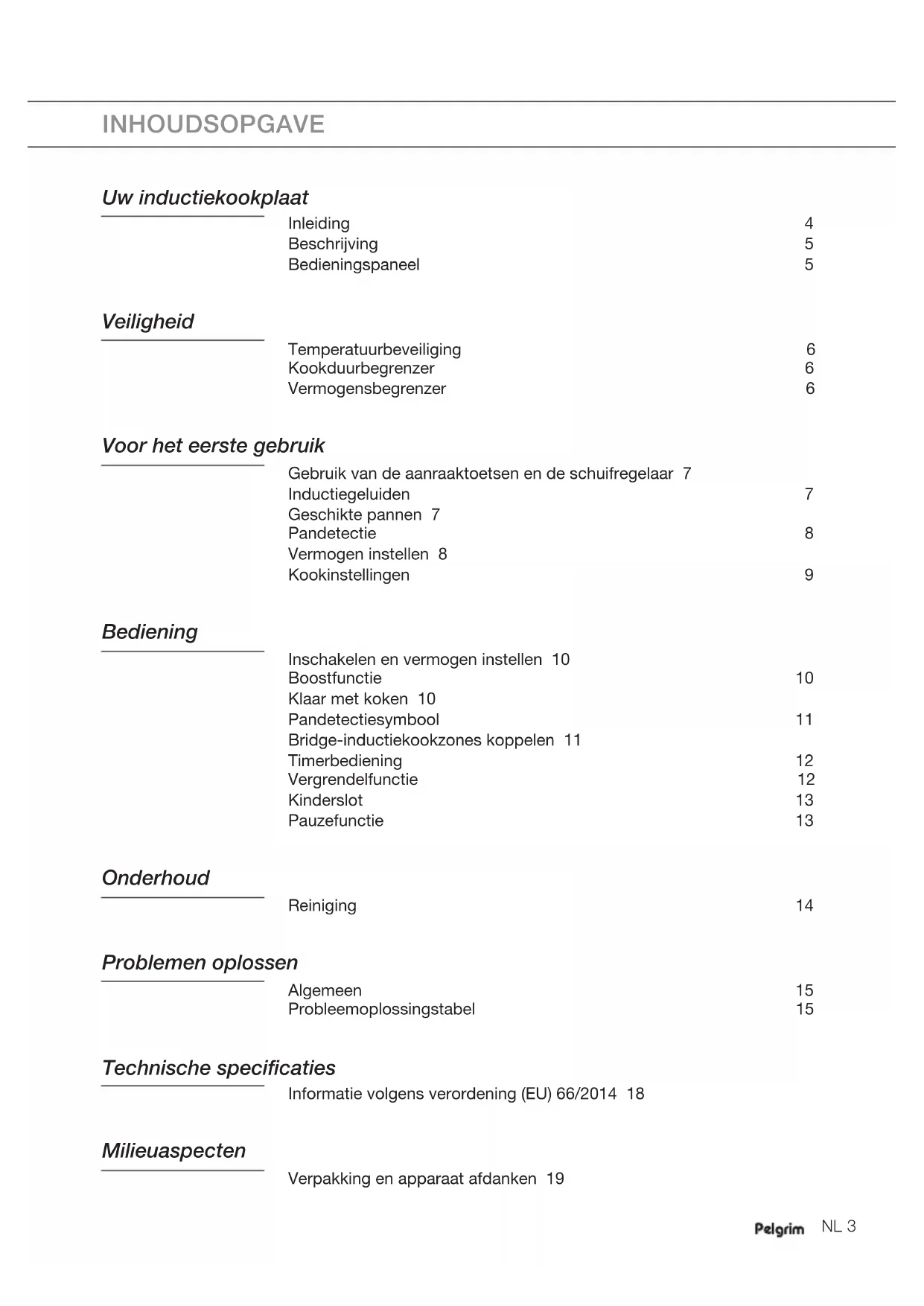 IK3072 ---NL 4 NL Handleiding NL 3 - NL 19 FR Manual FR 3 - FR 19 DE Manual DE 3 - DE 19 EN Manual EN 3 - EN 19 Gebruikte pictogrammen - Pictogrammes utilisés - Verwendete Piktogramme - Pictograms used Belangrijk om te weten - Important à savoir - Wichtig zu wissen - Important information Handig om te weten - Bon à savoir - Wissenswertes - Nice to knowNL 3 INHOUDSOPGAVE Uw inductiekookplaat Inleiding 4 Beschrijving 5 Bedieningspaneel 5 Veiligheid Temperatuurbeveiliging 6 Kookduurbegrenzer 6 Vermogensbegrenzer 6 Voor het eerste gebruik Gebruik van de aanraaktoetsen en de schuifregelaar 7 Inductiegeluiden 7 Geschikte pannen 7 Pandetectie 8 Vermogen instellen 8 Kookinstellingen 9 Bediening Inschakelen en vermogen instellen 10 Boostfunctie 10 Klaar met koken 10 Pandetectiesymbool 11 Bridge-inductiekookzones koppelen 11 Timerbediening 12 Vergrendelfunctie 12 Kinderslot 13 Pauzefunctie 13 Onderhoud Reiniging 14 Problemen oplossen Algemeen 15 Probleemoplossingstabel 15 Technische specificaties Informatie volgens verordening (EU) 66/2014 18 Milieuaspecten Verpakking en apparaat afdanken 19NL 4 Inleiding Gefeliciteerd met uw keuze voor dit toestel. In het ontwerp van dit product heeft eenvoudige bediening en optimale gebruiksvriendelijkheid centraal gestaan. In deze handleiding leest u hoe u dit toestel het best kunt gebruiken. Naast informatie over de bediening, vindt u hier ook achtergrondinformatie die u tijdens het gebruik van het toestel van pas kan komen. Lees eerst de separate veiligheidsinstructies voordat u het toestel gebruikt. Lees deze handleiding door voordat u het toestel in gebruik neemt, en berg de handleiding daarna veilig op voor toekomstig gebruik. Deze handleiding dient als referentie voor de servicedienst. Plak het typeplaatje in het daarvoor bestemde kader, achter op de handleiding. Het typeplaatje bevat alle informatie die de servicedienst nodig heeft om adequaat op uw vragen te reageren. De installatie-instructies worden afzonderlijk meegeleverd. Veel kookplezier! Op onze website kunt u de meest recente versie van de gebruiksaanwijzing vinden. UW INDUCTIEKOOKPLAATNL 5 Beschrijving