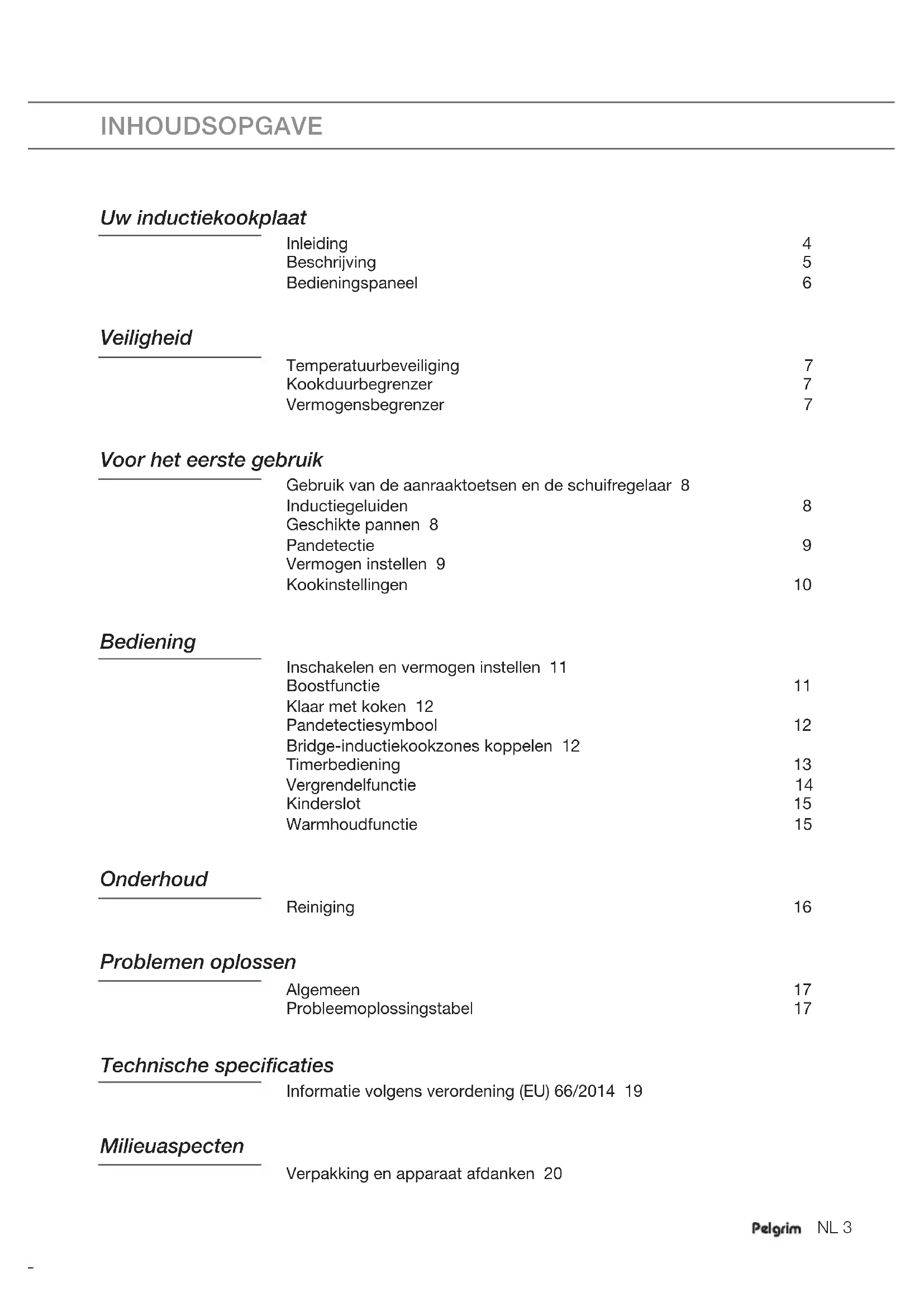 Gebruiksaanwijzing Inductiekookplaat Mode d’emploi Table de cuisson à induction Bedienungsanleitung Induktionskochfeld Instructions for use Induction hob IK3093 ---NL 4 NL Handleiding NL 3 - NL 20 FR Manual FR 3 - FR 20 DE Manual DE 3 - DE 20 EN Manual EN 3 - EN 20 Gebruikte pictogrammen - Pictogrammes utilisés - Verwendete Piktogramme - Pictograms used Belangrijk om te weten - Important à savoir - Wichtig zu wissen - Important information Handig om te weten - Bon à savoir - Wissenswertes - Nice to knowNL 3 INHOUDSOPGAVE Uw inductiekookplaat Inleiding 4 Beschrijving 5 Bedieningspaneel 6 Veiligheid Temperatuurbeveiliging 7 Kookduurbegrenzer 7 Vermogensbegrenzer 7 Voor het eerste gebruik Gebruik van de aanraaktoetsen en de schuifregelaar 8 Inductiegeluiden 8 Geschikte pannen 8 Pandetectie 9 Vermogen instellen 9 Kookinstellingen 10 Bediening Inschakelen en vermogen instellen 11 Boostfunctie 11 Klaar met koken 12 Pandetectiesymbool 12 Bridge-inductiekookzones koppelen 12 Timerbediening 13 Vergrendelfunctie 14 Kinderslot 15 Warmhoudfunctie 15 Onderhoud Reiniging 16 Problemen oplossen Algemeen 17 Probleemoplossingstabel 17 Technische specificaties Informatie volgens verordening (EU) 66/2014 19 Milieuaspecten Verpakking en apparaat afdanken 20NL 4 Inleiding Gefeliciteerd met uw keuze voor dit toestel. In het ontwerp van dit product heeft eenvoudige bediening en optimale gebruiksvriendelijkheid centraal gestaan. In deze handleiding leest u hoe u dit toestel het best kunt gebruiken. Naast informatie over de bediening, vindt u hier ook achtergrondinformatie die u tijdens het gebruik van het toestel van pas kan komen. Lees eerst de separate veiligheidsinstructies voordat u het toestel gebruikt. Lees deze handleiding door voordat u het toestel in gebruik neemt, en berg de handleiding daarna veilig op voor toekomstig gebruik. Deze handleiding dient als referentie voor de servicedienst. Plak het typeplaatje in het daarvoor bestemde kader, achter op de handleiding. Het typeplaatje bevat alle informatie die de servicedienst nodig heeft om adequaat op uw vragen te reageren. De installatie-instructies worden afzonderlijk meegeleverd. Veel kookplezier! Op onze website kunt u de meest recente versie van de gebruiksaanwijzing vinden. UW INDUCTIEKOOKPLAATNL 5 Beschrijving