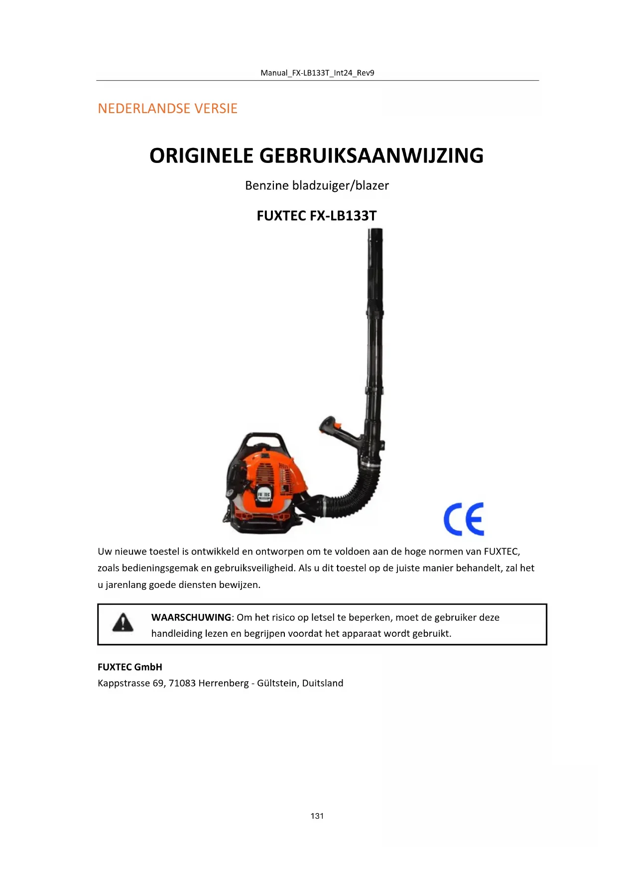 Uw nieuwe toestel is ontwikkeld en ontworpen om te voldoen aan de hoge normen van FUXTEC, zoals bedieningsgemak en gebruiksveiligheid. Als u dit toestel op de juiste manier behandelt, zal het u jarenlang goede diensten bewijzen. WAARSCHUWING: Om het risico op letsel te beperken, moet de gebruiker deze handleiding lezen en begrijpen voordat het apparaat wordt gebruikt. FUXTEC GmbH Kappstrasse 69, 71083 Herrenberg - Gültstein, DuitslandManual_FX-LB133T_Int24_Rev9