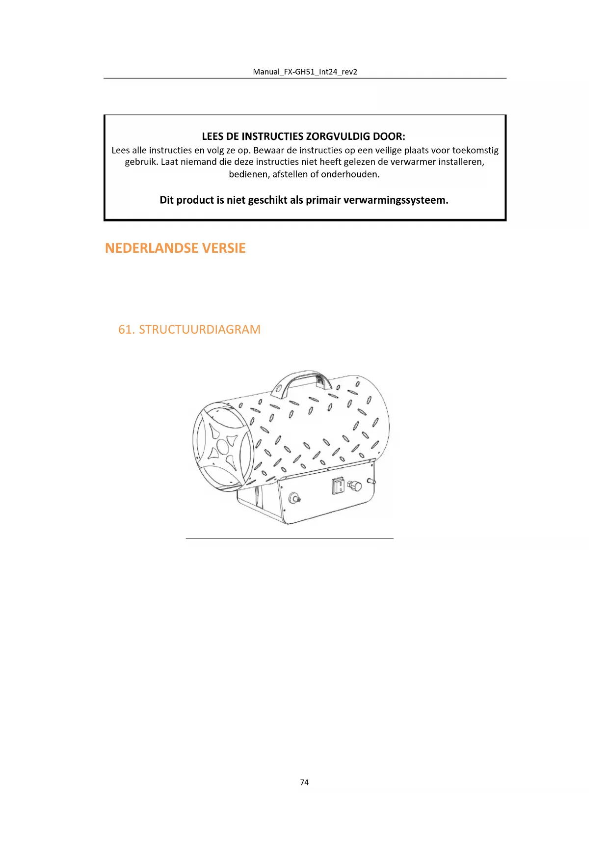 HET NIET OPVOLGEN VAN DE VOORZORGSMAATREGELEN EN INSTRUCTIES DIE BIJ HET VERWARMINGSAPPARAAT ZIJN GELEVERD, KAN LEIDEN TOT OVERLIJDEN, ERNSTIG PERSOONLIJK LETSEL EN VERLIES VAN OF SCHADE AAN EIGENDOMMEN DOOR BRAND, EXPLOSIE, BRANDWONDEN, VERSTIKKING, KOOLMONOXIDEVERGIFTIGING EN/OF ELEKTRISCHE SCHOKKEN. ALLEEN PERSONEN DIE DE INSTRUCTIES BEGRIJPEN EN KUNNEN OPVOLGEN, MOGEN DEZE VERWARMER GEBRUIKEN OF ONDERHOUDEN. NIET GESCHIKT VOOR GEBRUIK THUIS OF IN EEN STACARAVAN. Alleen gebruiken in een goed geventileerde ruimte en uit de buurt van ontvlambare materialen. NIET voor het verwarmen van woonruimtes in woongebouwen of voor gebruik in openbare gebouwen, zie nationale regelgeving. Schakel na gebruik de gastoevoer uit bij de cilinderafsluiter. Controleer of de ventilator goed werkt voordat u de branders aansteekt. Dit apparaat kan worden gebruikt door kinderen vanaf 8 jaar en personen met beperkte fysieke, zintuiglijke of mentale capaciteiten of gebrek aan ervaring en kennis, als ze onder toezicht staan of instructies hebben gekregen over het veilige gebruik van het apparaat en de gevaren begrijpen. Kinderen mogen niet met het apparaat spelen. Reiniging en onderhoud van het apparaat mogen niet worden uitgevoerd door kinderen zonder toezicht. WAARSCHUWING: Om oververhitting te voorkomen, mag het verwarmingselement niet worden afgedekt. Kinderen jonger dan 3 jaar moeten uit de buurt worden gehouden, tenzij ze onder voortdurend toezicht staan. Kinderen van 3 jaar tot jonger dan 8 jaar mogen het apparaat alleen in- en uitschakelen als het is opgesteld of geïnstalleerd in de daarvoor bestemde normale gebruikspositie en als ze toezicht of instructies hebben gekregen over het veilige gebruik van het apparaat en de bijbehorende gevaren begrijpen. Kinderen van 3 jaar en jonger dan 8 jaar mogen het apparaat niet aansluiten, afstellen of reinigen en geen onderhoudswerkzaamheden aan het apparaat uitvoeren. LET OP - sommige onderdelen van dit product kunnen zeer heet worden en brandwonden veroorzaken. Speciale aandacht moet worden besteed aan de aanwezigheid van kinderen en kwetsbare personen.Manual_FX-GH51_Int24_rev2
