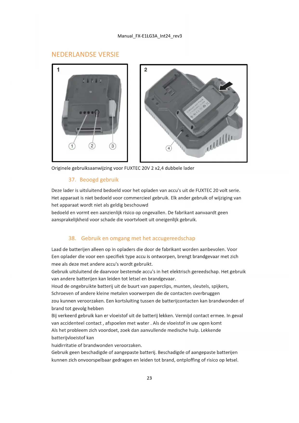 Laad de batterijen alleen op in opladers die door de fabrikant worden aanbevolen. Voor Een oplader die voor een specifiek type accu is ontworpen, brengt brandgevaar met zich mee als deze met andere accu's wordt gebruikt. Gebruik uitsluitend de daarvoor bestemde accu's in het elektrisch gereedschap. Het gebruik van andere batterijen kan leiden tot letsel en brandgevaar. Houd de ongebruikte batterij uit de buurt van paperclips, munten, sleutels, spijkers, Schroeven of andere kleine metalen voorwerpen die de contacten overbruggen zou kunnen veroorzaken. Een kortsluiting tussen de batterijcontacten kan brandwonden of brand tot gevolg hebben Bij verkeerd gebruik kan er vloeistof uit de batterij lekken. Vermijd contact ermee. In geval van accidenteel contact , afspoelen met water . Als de vloeistof in uw ogen komt Als het probleem zich voordoet, zoek dan aanvullende medische hulp. Lekkende batterijvloeistof kan huidirritatie of brandwonden veroorzaken. Gebruik geen beschadigde of aangepaste batterij. Beschadigde of aangepaste batterijen kunnen zich onvoorspelbaar gedragen en leiden tot brand, ontploffing of risico op letsel.Manual_FX-E1LG3A_Int24_rev3