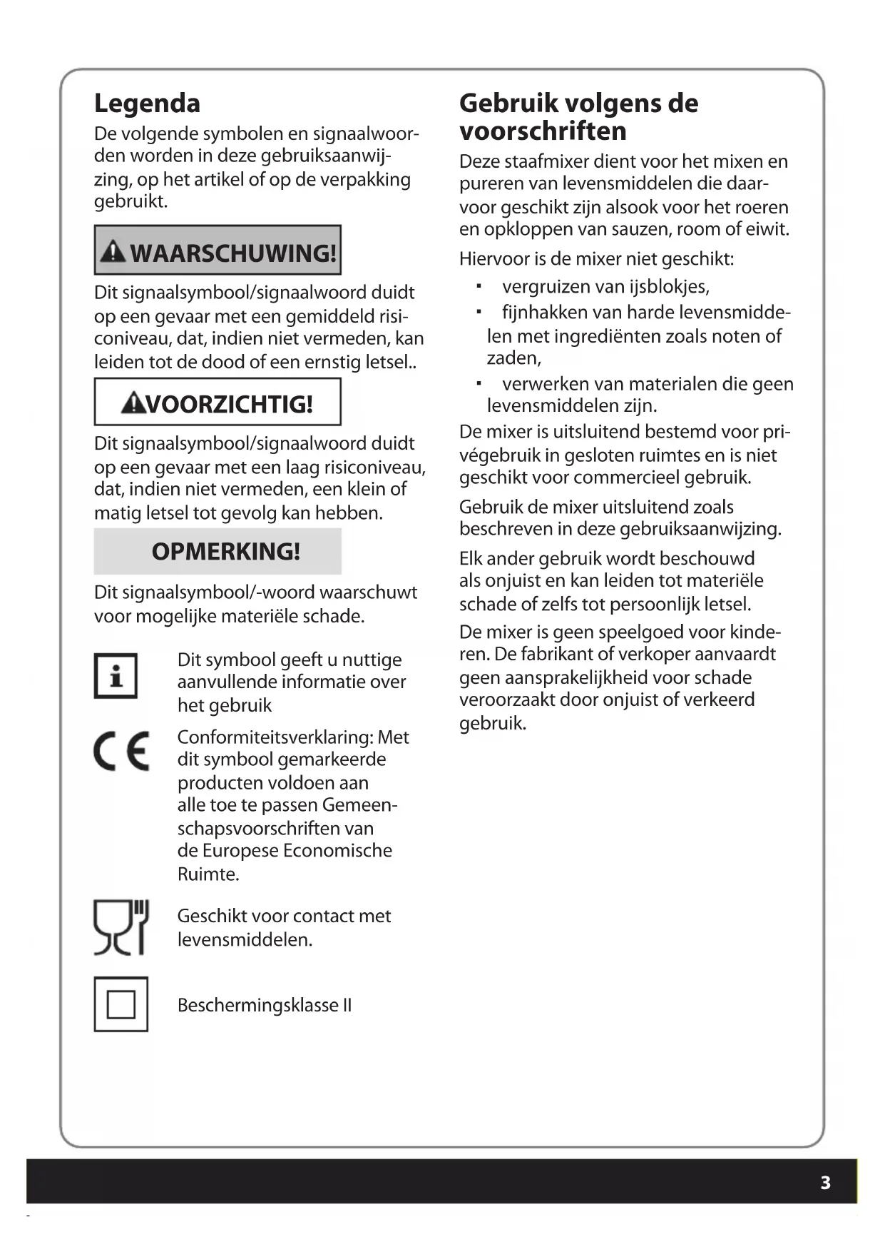 hun lichamelijke en geestelijke capa- citeiten) of een gebrek aan ervaring en kennis (bijvoorbeeld oudere kinderen). De mixer mag door personen met verminderde fysieke, sensorische of mentale capaciteiten of een gebrek aan ervaring en/of kennis worden gebruikt als er toezicht op hen is of als ze geïnstrueerd werden met betrekking tot het veilige gebruik van het apparaat en de daaruit voortvloeiende gevaren hebben begrepen. De mixer mag niet door kinderen worden gebruikt. Houd kinderen uit de buurt van de mixer en de stroomkabel. Reiniging en gebruikers- onderhoud mogen niet worden uitgevoerd door kinderen. Laat kinderen niet spelen met de mixer. Houd kinderen uit de buurt van ver- pakkingsmateriaal en de meegele- verde kleine onderdelen. Er bestaat verstikkingsgevaar als verpakkings- materiaal en kleine onderdelen worden ingeslikt. Zorg er ook voor dat de verpakkingszak niet over het hoofd wordt getrokken. VOORZICHTIG! Risico op letsels! Onjuist omgaan met de mixer kan leiden tot verwondingen. Grijp nooit in het nog draaiende mes of de nog roterende garde. Houd ander keukengerei zoals bijvoor- beeld lepels, uit de buurt van het mes. Het mes is scherp. Voorzichtig zijn bij het hanteren of schoonmaken van het apparaat. Voorzichtig zijn bij het leegmaken van de mengbeker. Zet de mixer pas aan als de kop van de pureerstaaf ondergedompeld is in het te pureren voedsel. Zet de mixer weer uit voordat u de pureer- staaf uit het gepureerde voedsel haalt. Bij de verwerking van heet voedsel bestaat gevaar voor brandwonden of verbranding door hete spatten. Bedek blote huid en draag geschikte keukenhandschoenen. Na het uitschakelen blijft het mes in de kop van de pureerstaaf of de garde nog korte tijd draaien. Wacht tot de draaiende delen volledig tot stilstand zijn gekomen voordat u de mixer hanteert. OPMERKING! Gevaar voor schade! Onjuiste behandeling van de mixer kan leiden tot schade aan het apparaat. Het apparaat is ontworpen voor kortstondig gebruik (KG): Bij gebruik van de pureerstaaf: 1 minuut Bij gebruik van de garde: 2 minuten Daarna moet het apparaat ongeveer 3 minuten afkoelen voordat u het opnieuw gebruikt. Met dit apparaat mogen enkel voedingsmiddelen worden verwerkt die daarvoor geschikt zijn. Harde levensmiddelen zoals bijvoorbeeld ijsblokjes en koffiebonen zijn niet geschikt. Gedroogde peulvruchten moeten voor de verwerking worden geweekt. Druckbuch Stabmixer BEL.indb 5Druckbuch Stabmixer BEL.indb 5 23.06.2023 08:39:1023.06.2023 08:39:106 Bij het verwerken van voedings- middelen kunnen er altijd spatten ontstaan. Zorg er tijdens het gebruik altijd voor dat de ondergrond stabiel, ongevoelig en gemakkelijk schoon te vegen is. Dompel de pureerstaaf/garde niet te diep in het te verwerken voedsel. De motorbehuizing mag niet worden ondergedompeld. Als u bijvoorbeeld potten, bakken enz. met antiaanbaklaag gebruikt om te mengen: zet de mixer niet op hun bodem. De coating kan beschadigd raken. Stop onmiddellijk met het verwer- ken van voedsel als het mes of de garde niet meer of alleen nog zeer traag draait en trek de stekker uit het stopcontact. Controleer: - of er zich een vreemd vreemde voorwerp in het recipiënt bevindt, - of het voedsel te taai of te vast is, - of het mes of de garde geblokkeerd is, - of de mixer echt goed in elkaar zit. Gebruik alleen de artikelen die bij de levering zitten. Combineer de mixer niet met de onderdelen van een andere mixer. Gebruik geen stoomreinigers, scherpe voorwerpen, agressieve chemicaliën, harde, krassende of schurende reinigingsmiddelen. Sommige onderdelen mogen niet in de vaatwasser. Zie het hoofdstuk “Schoonmaken en onderhoud”. De staafmixer en bijna alle andere onderdelen mogen niet in de vaat- wasser. Levering Staafmixer en toebehoren Gebruiksaanwijzing Garantiebewijs Druckbuch Stabmixer BEL.indb 6Druckbuch Stabmixer BEL.indb 6 23.06.2023 08:39:1023.06.2023 08:39:10Onderdelen en bedieningselementen Onderdelen en bedieningselementen