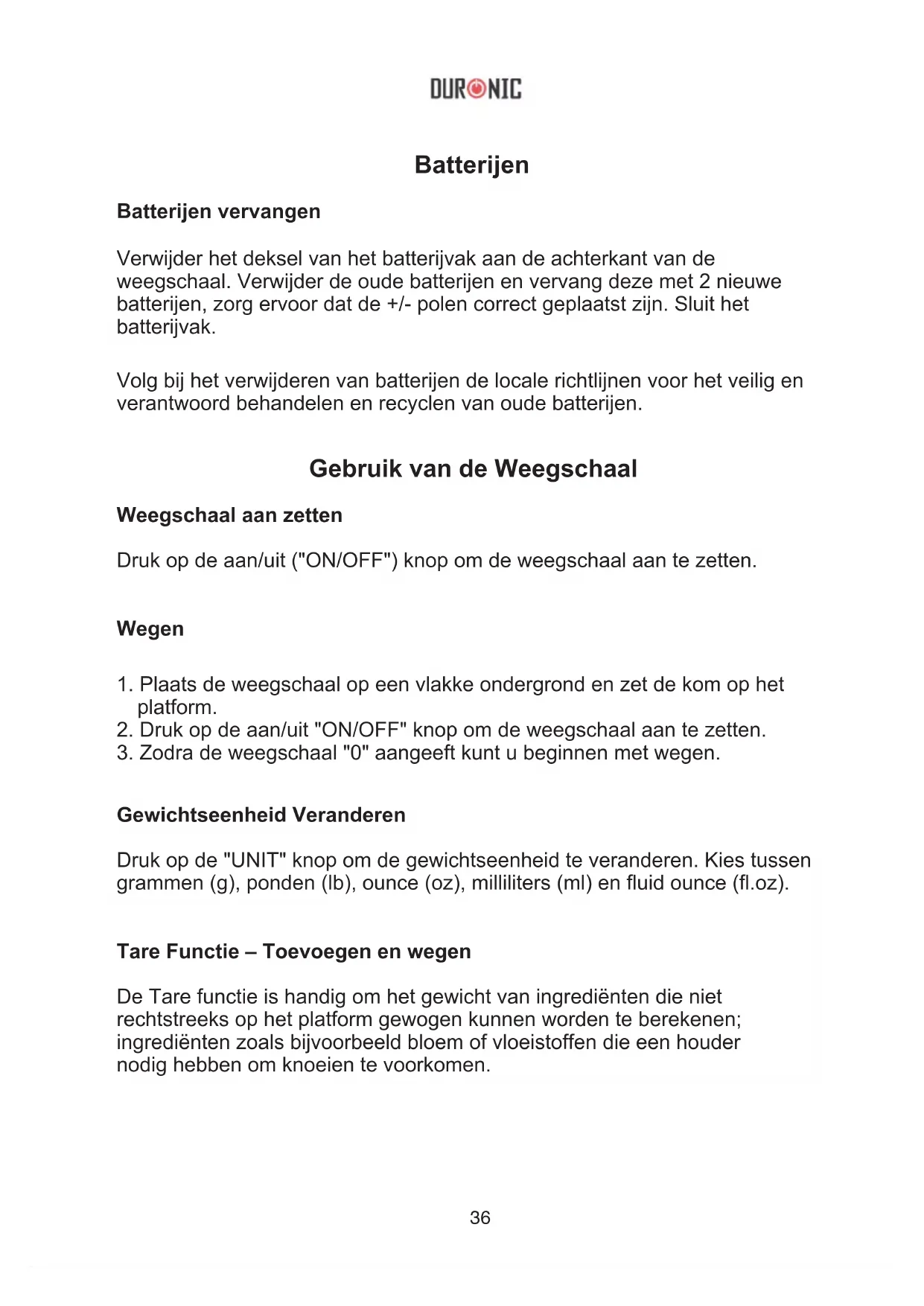 Gewichtseenheid Veranderen Druk op de "UNIT" knop om de gewichtseenheid te veranderen. Kies tussen grammen (g), ponden (lb), ounce (oz), milliliters (ml) en fluid ounce (fl.oz). Tare Functie – Toevoegen en wegen De Tare functie is handig om het gewicht van ingrediënten die niet rechtstreeks op het platform gewogen kunnen worden te berekenen; ingrediënten zoals bijvoorbeeld bloem of vloeistoffen die een houder nodig hebben om knoeien te voorkomen.37 De Tare functie is ook ideaal om verschillende ingrediënten te wegen die u na elkaar aan de mengkom toevoegt, u kunt bijvoorbeeld na het eerste ingrediënt op de "ON/OFF" knop drukken om de weegschaal te resetten zodat deze weer op "0" gaat, wat het gemakkelijker maakt om het volgende ingrediënt precies te wegen. Automatisch Uitschakelen De weegschaal schakelt na 60 seconden zonder gebruik automatisch uit. Handmatig uitschakelen De weegschaal kan op elk moment handmatig uitgeschakeld worden door op de aan/uit ("ON/OFF") knop 2 seconden lang ingedrukt te houden. Schoonmaak en Onderhouden Zorg dat de weegschaal alleen op een droge, vlakke ondergrond gebruikt wordt. De weegschaal is niet waterbestendig, stel het product bloot aan vocht en dompel het niet onder in water of andere vloeistoffen. Om de weegschaal schoon te maken kunt u deze afnemen met een licht vochtige doek. Gebruik geen chemische schoonmaakproducten of schuurmiddelen om de weegschaal schoon te maken. Verwijder, in het geval dat u de weegschaal voor lange tijd niet zult gebruiken, de batterijen voor het apparaat op te bergen. Batterij bijna leeg Dit symbool geeft van tevoren aan dat de batterij binnenkort leeg zal zijn. Batterij leeg Dit geeft aan dat dat de batterijen verwisseld moeten worden. Negatief gewicht: Dit wordt getoond wanneer gewicht van het platform wordt verwijderd terwijl de weegschaal tijdens het gebruik van de Tare functie. Overbelast Dit betekent dat het limiet voor maximumgewicht is overschreden. Verwijder het voorwerp of een deel van de ingrediënten om schade aan de weegschaal te voorkomen.38 Garantie 1 Jaar Garantie van Shine-Mart Ltd Handelsmerk eigenaars van Duronic Producten. LET OP: DEZE STELLINGEN HEBBEN GEEN INVLOED OP UW WETTELIJKE RECHTEN ALS CONSUMENT Dit product is vervaardigd onder de strengste kwaliteitscontrole procedures, met materialen van de hoogste kwaliteit, om uitstekende werking en betrouwbaarheid te verzekeren. Het zal zeer goed en langdurig dienstdoen, naar gelang het correct gebruikt en onderhouden wordt. Het product heeft 1 jaar garantie van de originele aankoopdatum. Als een defect zich toont vanwege een materiaal- of constructiefout, dient het defecte apparaat bij de originele aankoop locatie geretourneerd te worden. Terugbetaling of vervanging is ter discretie van dat bedrijf. Duronic Producten worden aangeboden met een 1-jarige garantie onder de volgende omstandigheden: