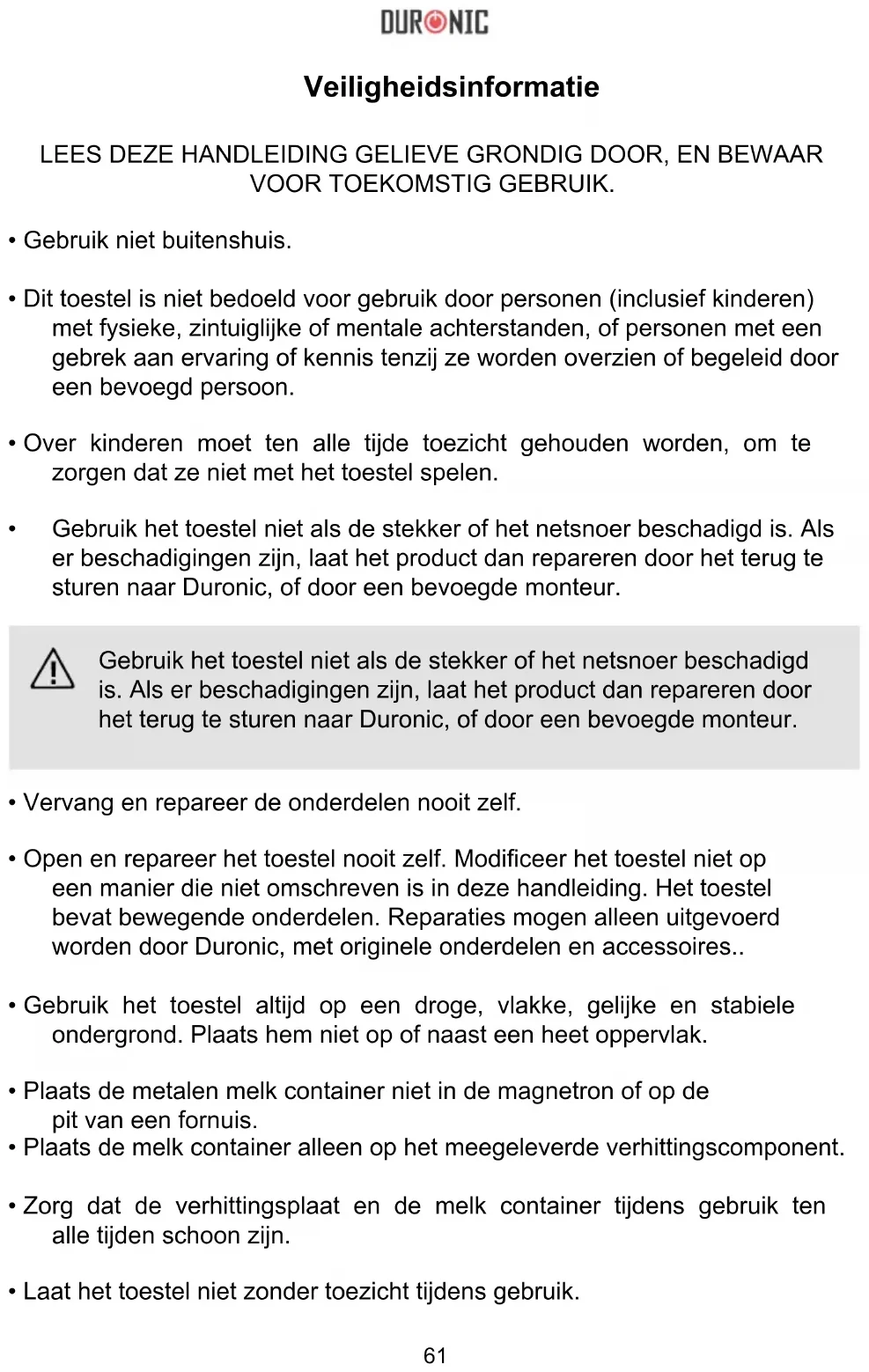 - Open en repareer het toestel nooit zelf. Modificeer het toestel niet op een manier die niet omschreven is in deze handleiding. Het toestel bevat bewegende onderdelen. Reparaties mogen alleen uitgevoerd worden door Duronic, met originele onderdelen en accessoires..