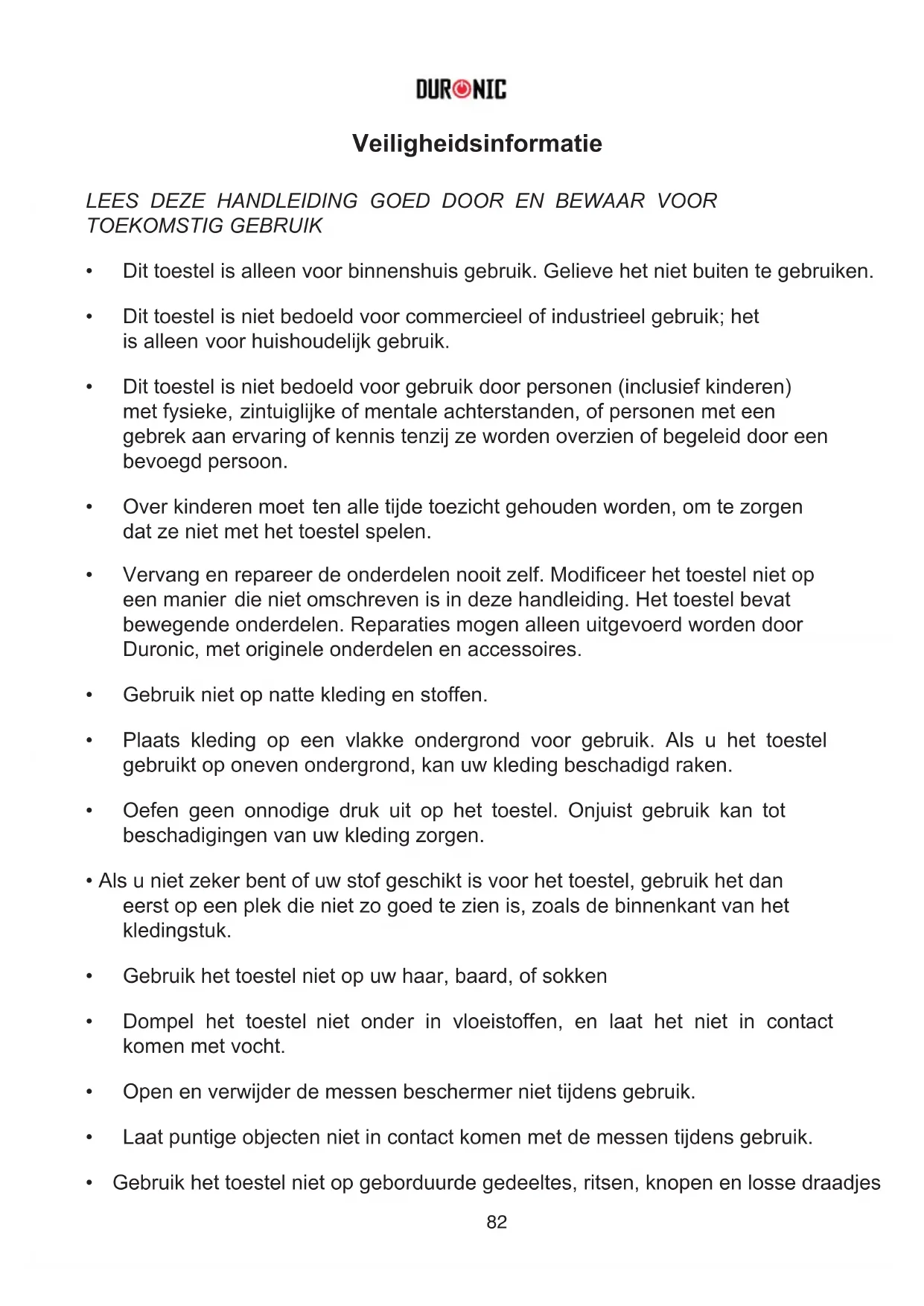 - Gebruik het toestel niet op geborduurde gedeeltes, ritsen, knopen en losse draadjes Veiligheidsinformatie LEES DEZE HANDLEIDING GOED DOOR EN BEWAAR VOOR TOEKOMSTIG GEBRUIK Dit toestel is alleen voor binnenshuis gebruik. Gelieve het niet buiten te gebruiken. Dit toestel is niet bedoeld voor commercieel of industrieel gebruik; het is alleen voor huishoudelijk gebruik. Dit toestel is niet bedoeld voor gebruik door personen (inclusief kinderen) met fysieke, zintuiglijke of mentale achterstanden, of personen met een gebrek aan ervaring of kennis tenzij ze worden overzien of begeleid door een bevoegd persoon. Over kinderen moet ten alle tijde toezicht gehouden worden, om te zorgen dat ze niet met het toestel spelen. Vervang en repareer de onderdelen nooit zelf. Modificeer het toestel niet op een manier die niet omschreven is in deze handleiding. Het toestel bevat bewegende onderdelen. Reparaties mogen alleen uitgevoerd worden door Duronic, met originele onderdelen en accessoires. Gebruik niet op natte kleding en stoffen. Gebruik het toestel niet op uw haar, baard, of sokken Dompel het toestel niet onder in vloeistoffen, en laat het niet in contact komen met vocht. Open en verwijder de messen beschermer niet tijdens gebruik. Laat puntige objecten niet in contact komen met de messen tijdens gebruik.83