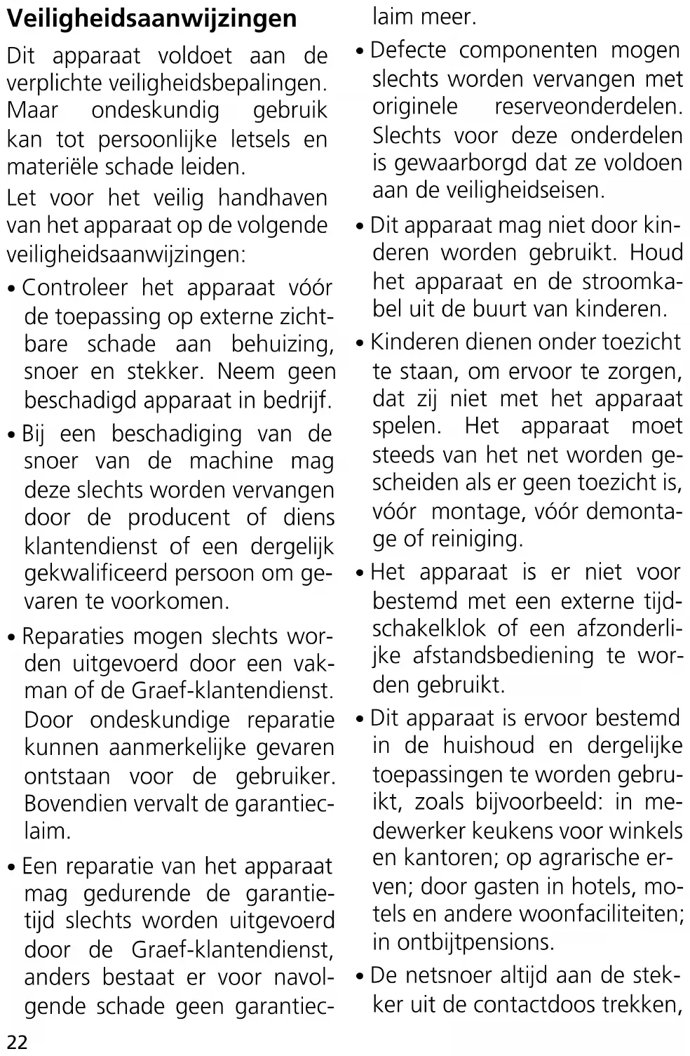 - Reparaties mogen slechts wor- den uitgevoerd door een vak- man of de Graef-klantendienst. Door ondeskundige reparatie kunnen aanmerkelijke gevaren ontstaan voor de gebruiker. Bovendien vervalt de garantiec- laim.