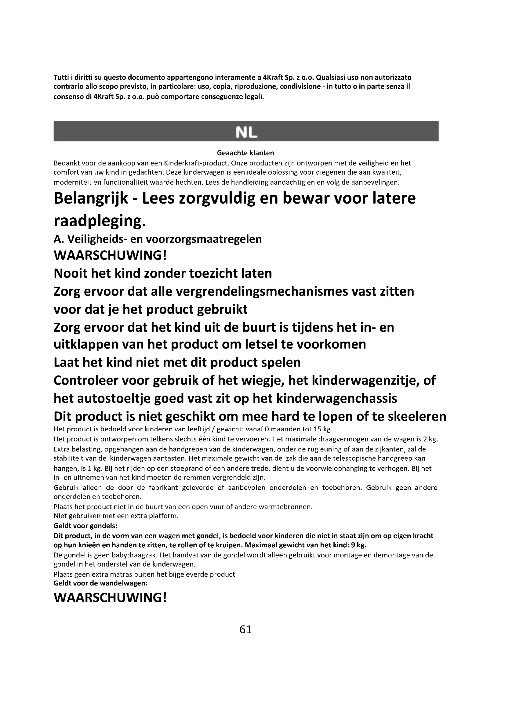 Tutti i diritti su questo documento appartengono interamente a 4Kraft Sp. z o.o. Qualsiasi uso non autorizzato contrario allo scopo previsto, in particolare: uso, copia, riproduzione, condivisione - in tutto o in parte senza il consenso di 4Kraft Sp. z o.o. può comportare conseguenze legali. Geaachte klanten Bedankt voor de aankoop van een Kinderkraft-product. Onze producten zijn ontworpen met de veiligheid en het comfort van uw kind in gedachten. Deze kinderwagen is een ideale oplossing voor diegenen die aan kwaliteit, moderniteit en functionaliteit waarde hechten. Lees de handleiding aandachtig en en volg de aanbevelingen. Belangrijk - Lees zorgvuldig en bewar voor latere raadpleging. A. Veiligheids- en voorzorgsmaatregelen WAARSCHUWING! Nooit het kind zonder toezicht laten Zorg ervoor dat alle vergrendelingsmechanismes vast zitten voor dat je het product gebruikt Zorg ervoor dat het kind uit de buurt is tijdens het in- en uitklappen van het product om letsel te voorkomen Laat het kind niet met dit product spelen Controleer voor gebruik of het wiegje, het kinderwagenzitje, of het autostoeltje goed vast zit op het kinderwagenchassis Dit product is niet geschikt om mee hard te lopen of te skeeleren Het product is bedoeld voor kinderen van leeftijd / gewicht: vanaf 0 maanden tot 15 kg. Het product is ontworpen om telkens slechts één kind te vervoeren. Het maximale draagvermogen van de wagen is 2 kg. Extra belasting, opgehangen aan de handgrepen van de kinderwagen, onder de rugleuning of aan de zijkanten, zal de stabiliteit van de kinderwagen aantasten. Het maximale gewicht van de zak die aan de telescopische handgreep kan hangen, is 1 kg. Bij het rijden op een stoeprand of een andere trede, dient u de voorwielophanging te verhogen. Bij het in- en uitnemen van het kind moeten de remmen vergrendeld zijn. Gebruik alleen de door de fabrikant geleverde of aanbevolen onderdelen en toebehoren. Gebruik geen andere onderdelen en toebehoren. Plaats het product niet in de buurt van een open vuur of andere warmtebronnen. Niet gebruiken met een extra platform. Geldt voor gondels: Dit product, in de vorm van een wagen met gondel, is bedoeld voor kinderen die niet in staat zijn om op eigen kracht op hun knieën en handen te zitten, te rollen of te kruipen. Maximaal gewicht van het kind: 9 kg. De gondel is geen babydraagzak. Het handvat van de gondel wordt alleen gebruikt voor montage en demontage van de gondel in het onderstel van de kinderwagen. Plaats geen extra matras buiten het bijgeleverde product. Geldt voor de wandelwagen: WAARSCHUWING!62 Dit kinderwagenzitje is niet geschikt voor kinderen jonger dan 6 maanden Altijd het veiligheidstuigje gebruiken Dit product is bedoeld voor kinderen van 6 maanden tot 15 kg. Geldt voor het Kinderkraft MINK autostoeltje: De Kinderkraft VEO kinderwagen kan geleverd worden met een compatibel Kinderkraft MINK autostoeltje. Het product is bedoeld voor kinderen vanaf de geboorte tot 13 kg. Als het autostoeltje wordt gebruikt in combinatie met een kinderwagen, vervangt het niet een wieg of een kinderbedje. Als uw kind moet slapen, moet het in een gondel, wieg of bedje geplaatst worden. I Onderdelen van de kinderwagen A. Onderstel B. Voorwielen C. Achterwielen D. Achteras met rem E. Veiligheidsbeugel F. Zitting/gondel 2in1 G. Overkapping H. Veiligheidsgordels