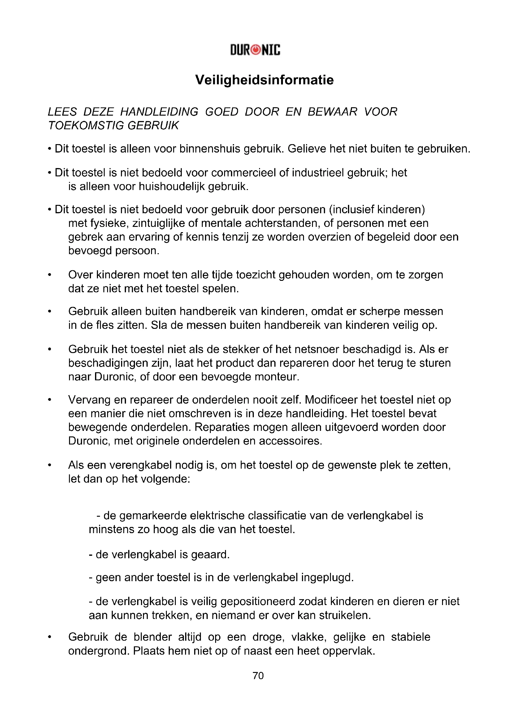 Vervang en repareer de onderdelen nooit zelf. Modificeer het toestel niet op een manier die niet omschreven is in deze handleiding. Het toestel bevat bewegende onderdelen. Reparaties mogen alleen uitgevoerd worden door Duronic, met originele onderdelen en accessoires.