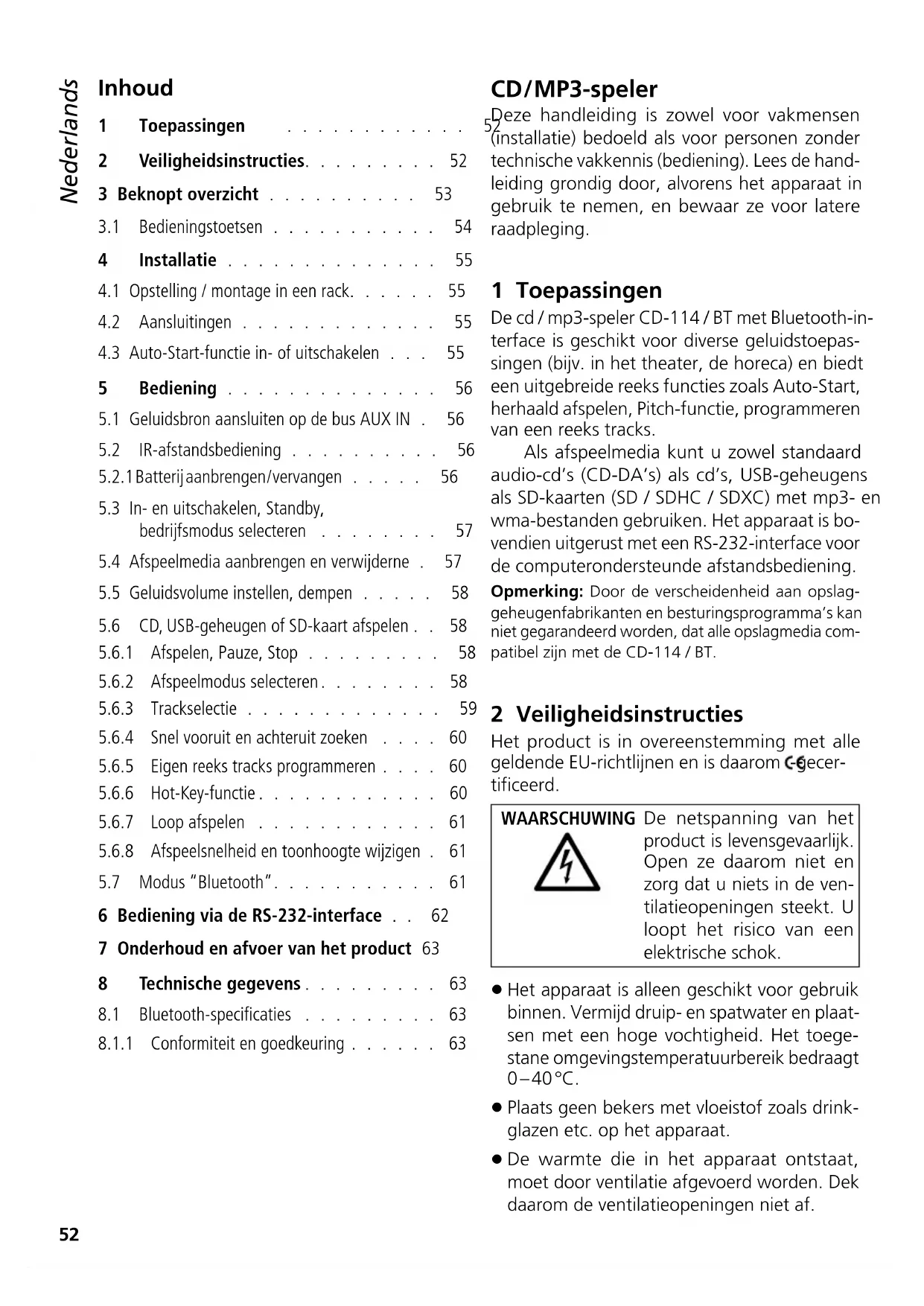 INTERNATIONAL GmbH & Co. KG si riserva ogni diritto di elaborazione in qualsiasi forma delle presenti istruzioni per l’uso. La riproduzione – anche parziale – per propri scopi commerciali è vietata. *Memoria USB e scheda SD: solo WMA 9.2 Con riserva di modifiche.52 Deutsch Deutsch Seite Inhalt English English Page Contents Français Français Page Table des matières Italiano Italiano Pagina Indice Español Español Página Contenidos Nederlands Nederlands Pagina Inhoud Polski Polski Strona Spis treści Nederlands Nederlands Nederlands Pagina Inhoud CD / MP3-speler Deze handleiding is zowel voor vakmensen (installatie) bedoeld als voor personen zonder technische vakkennis (bediening). Lees de hand- leiding grondig door, alvorens het apparaat in gebruik te nemen, en bewaar ze voor latere raadpleging. 1 Toepassingen De cd / mp3-speler CD-114 / BT met Bluetooth-in- terface is geschikt voor diverse geluidstoepas- singen (bijv. in het theater, de horeca) en biedt een uitgebreide reeks functies zoals Auto-Start, herhaald afspelen, Pitch-functie, programmeren van een reeks tracks. Als afspeelmedia kunt u zowel standaard audio-cd’s (CD-DA’s) als cd’s, USB-geheugens als SD-kaarten (SD / SDHC / SDXC) met mp3- en wma-bestanden gebruiken. Het apparaat is bo- vendien uitgerust met een RS-232-interface voor de computerondersteunde afstandsbediening. Opmerking: Door de verscheidenheid aan opslag- geheugenfabrikanten en besturingsprogramma’s kan niet gegarandeerd worden, dat alle opslagmedia com- patibel zijn met de CD-114 / BT. 2 Veiligheidsinstructies Het product is in overeenstemming met alle geldende EU-richtlijnen en is daarom -gecer- tificeerd. WAARSCHUWING De netspanning van het product is levensgevaarlijk. Open ze daarom niet en zorg dat u niets in de ven- tilatieopeningen steekt. U loopt het risico van een elektrische schok.