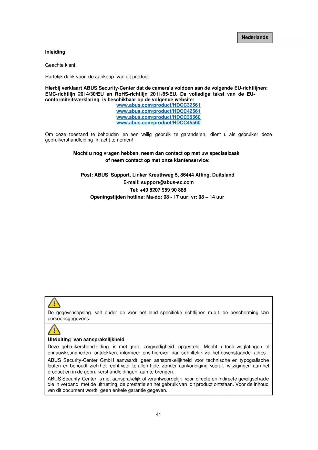 Uitsluiting van aansprakelijkheid Deze gebruikershandleiding is met grote zorgvuldigheid opgesteld. Mocht u toch weglatingen of onnauwkeurigheden ontdekken, informeer ons hierover dan schriftelijk via het bovenstaande adres. ABUS Security-Center GmbH aanvaardt geen aansprakelijkheid voor technische en typografische fouten en behoudt zich het recht voor te allen tijde, zonder aankondiging vooraf, wijzigingen aan het product en in de gebruikershandleidingen aan te brengen. ABUS Security-Center is niet aansprakelijk of verantwoordelijk voor directe en indirecte gevolgschade die in verband met de uitrusting, de prestatie en het gebruik van dit product ontstaan. Voor de inhoud van dit document wordt geen enkele garantie gegeven.42 Nederlands Verklaring van symbolen