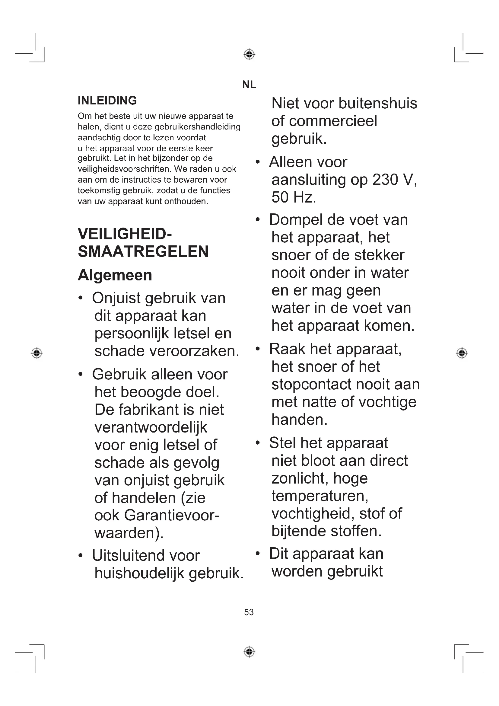 INLEIDING Om het beste uit uw nieuwe apparaat te halen, dient u deze gebruikershandleiding aandachtig door te lezen voordat u het apparaat voor de eerste keer gebruikt. Let in het bijzonder op de veiligheidsvoorschriften. We raden u ook aan om de instructies te bewaren voor toekomstig gebruik, zodat u de functies van uw apparaat kunt onthouden. VEILIGHEID- SMAATREGELEN Algemeen