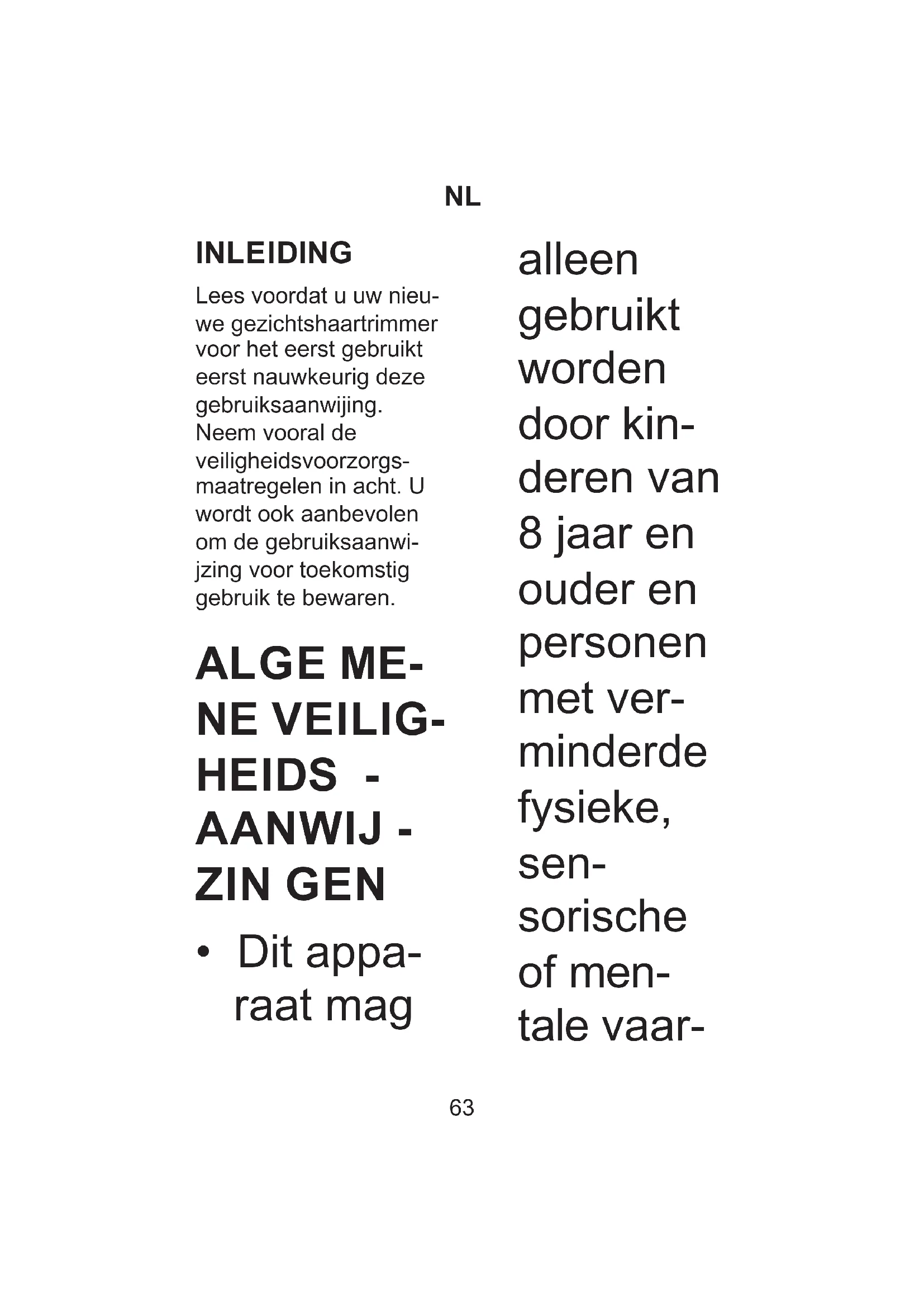 INLEIDING Lees voordat u uw nieu- we gezichtshaartrimmer voor het eerst gebruikt eerst nauwkeurig deze gebruiksaanwijing. Neem vooral de veiligheidsvoorzorgs- maatregelen in acht. U wordt ook aanbevolen om de gebruiksaanwi- jzing voor toekomstig gebruik te bewaren. ALGE ME- NE VEILIG- HEIDS - AANWIJ - ZIN GEN