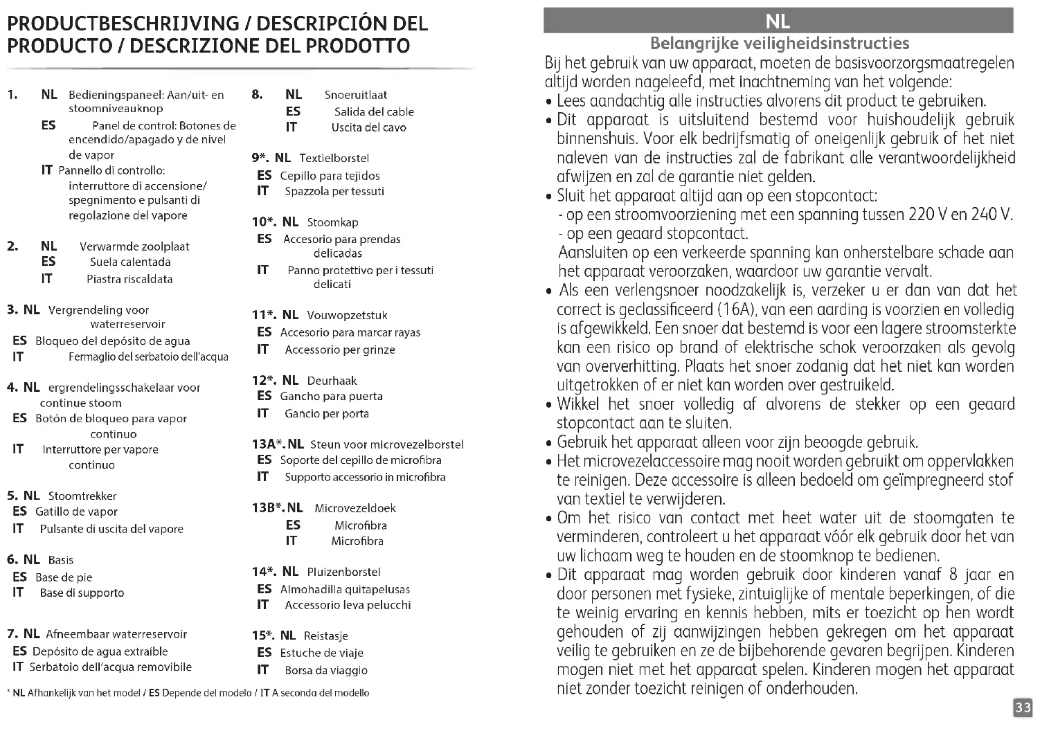 Er is geen stoom.Het apparaat is niet aangesloten of is uitgeschakeld.Controleer of uw apparaat correct is aangesloten en is ingeschakeld.Het waterpeil is te laag.Trek de stekker van uw apparaat uit het stopcontact en vul het bij.De stoompomp is niet geactiveerd.Houd de stoomknop gedurende enkele seconden ingedrukt om stoom te genereren.U gebruikt het apparaat voor de eerste keer.Houd de stoomknop gedurende enkele seconden ingedrukt om stoom te genereren.Het waterreservoir is niet goed vastgeklikt.Zorg ervoor dat de stop is afgesloten en dat het waterreservoir in het apparaat klikt.Het apparaat staat in de stand-bymodus* of schakelt automatisch uit*.RAADPLEEG HET GEDEELTE ‘STAND-BY/AUTO-OFF’Het apparaat warmt niet op.Het is niet aangesloten of is uitgeschakeld.Steek de stekker weer in het stopcontact en schakel uw apparaat weer in.Het apparaat staat in de stand-bymodus* of schakelt automatisch uit*.RAADPLEEG HET GEDEELTE ‘STAND-BY/AUTO-OFF’Waterlekken.Het waterreservoir is niet goed vastgeklikt of de stop is niet goed afgesloten.Zorg ervoor dat de stop is afgesloten en dat het waterreservoir in het apparaat klikt.De boostmodus is te vaak gebruikt (meer dan 3 keer per minuut)Gebruik de boost niet langer dan 3 keer per minuut.De hoeveelheid stoom neemt af.Er heeft zich kalk gevormd in het apparaatRaadpleeg het gedeelte ‘MAKKELIJK ONTKALKEN’ in de gebruiksaanwijzing.De stoom laat vlekken achter op de stof of het apparaat spettert.U gebruikt water met additieven.Voeg nooit een ander product toe aan het waterreservoir.Het apparaat is niet genoeg gereinigd na de ontkalking.Lees het gedeelte ‘MAKKELIJK ONTKALKEN’ in de gebruiksaanwijzing zorgvuldig door.U gebruikt andere vloeistoffen dan witte azijn om het apparaat te ontkalken.Gebruik alleen witte azijn tijdens de ‘MAKKELIJK ONTKALKEN’-procedure.Het apparaat geeft onafgebroken stoom af.De stoomhendel staat in de vergrendelstand.Ontgrendel de stoomhendel.De steun van de microvezelborstel* is verwijderd van de stoomkop. Microvezeldoek is verwijderd van de steun van de microvezelborstel.Je trekt het textiel te strak.Stoom het textiel zachtjes om geïmpregneerd stof te verwijderen.