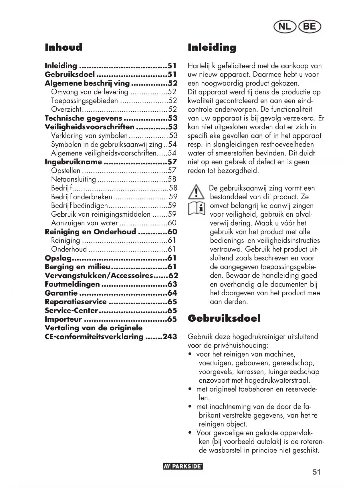 De waarden voor lawaai en trillingen werden volgens EN60335-2-79:2012 bepaald. Dit apparaat is bedoeld voor gebruik op een stroomnet met een bedrij fsstroomcapa- citeit op het overdrachtspunt (huisaanslui- ting) van maximaal 100 A per fase. De gebruiker moet ervoor zorgen dat het apparaat uitsluitend wordt aangesloten op een stroomnet dat aan deze vereiste voldoet. Indien nodig, kan de bedrij fsstroomca- paciteit bij het plaatselij ke energiebedrij f worden nagevraagd. De aangegeven trillingemissiewaarde werd volgens een genormaliseerd testme- thode gemeten en kan ter vergelij king van een stuk elektrisch gereedschap met een ander gebruikt worden. De aangegeven trillingemissiewaarde kan ook voor een inleidende inschatting van de blootstelling benut worden. Waarschuwing: Afhankelij k van de manier, waarop het elektrische gereedschap ge- bruikt wordt, kan de trilingemis- siewaarde tij dens het effectieve gebruik van het elektrische gereed- schap van de aangegeven waarde verschillen. Probeer de belasting door trillingen zo gering mogelij k te houden. Voorbeeldmaatregelen voor de re- ductie van trillingsbelasting zij n het dragen van handschoenen bij het gebruik van het gereedschap en de beperking van de werktij d. Daarbij moeten alle delen van de bedrij fs- cyclus in acht worden genomen (bij voorbeeld tij den, waarop het elek- trische werktuig is uitgeschakeld en tij den waarin het weliswaar is ingeschakeld, maar zonder belas- ting draait). Veiligheidsvoorschriften Dit hoofdstuk behandelt de fundamentele veiligheidsvoorschriften bij het werken met de hogedrukreiniger. Verklaring van symbolen Let op! Maakt u zich eerst met alle bedie- ningselementen vertrouwd, in het bij zonder met hun funktie en werk- wij ze. Vraag een vakman eventueel om raad. Let op! Trek bij beschadiging of doorsnij den van de netaansluitings-54