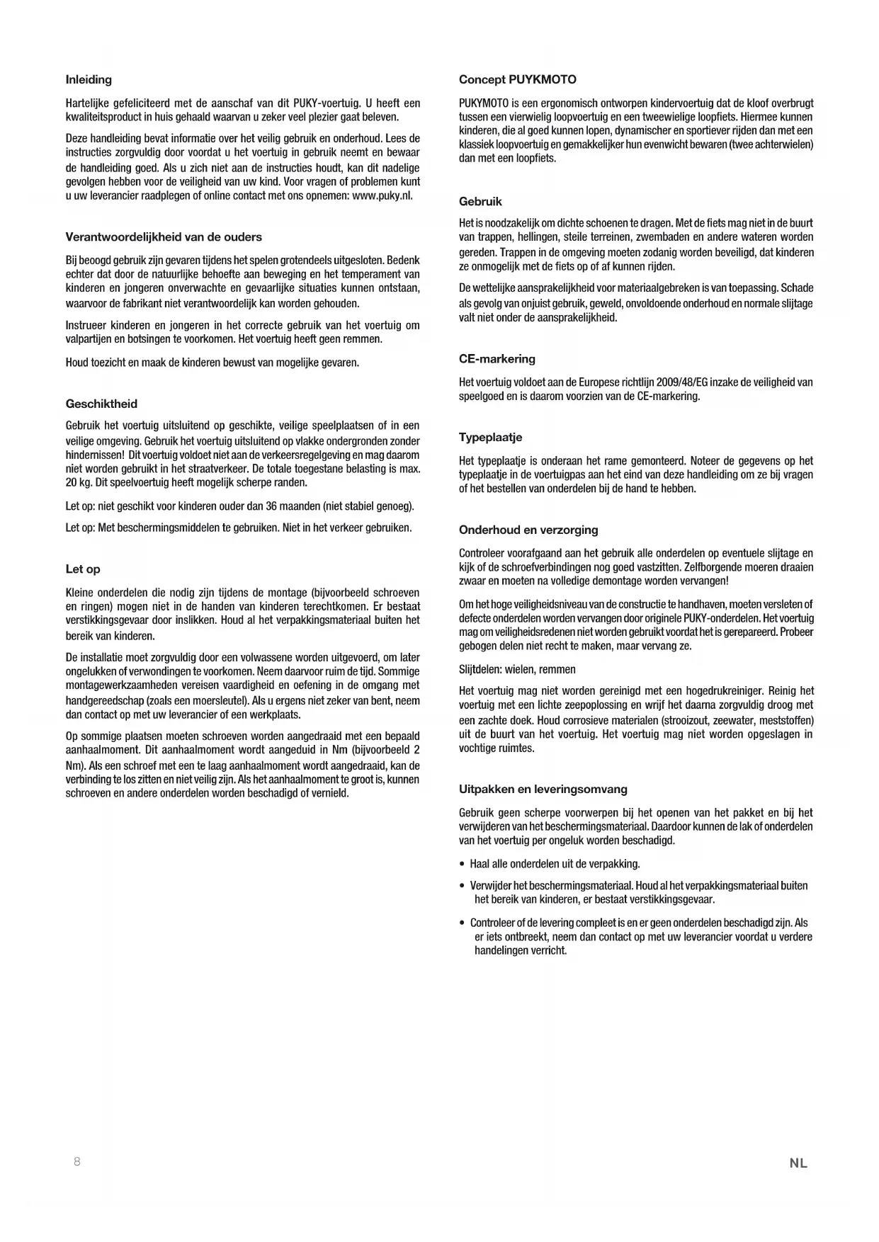 Inleiding Hartelijke gefeliciteerd met de aanschaf van dit PUKY-voertuig. U heeft een kwaliteitsproduct in huis gehaald waarvan u zeker veel plezier gaat beleven. Deze handleiding bevat informatie over het veilig gebruik en onderhoud. Lees de instructies zorgvuldig door voordat u het voertuig in gebruik neemt en bewaar de handleiding goed. Als u zich niet aan de instructies houdt, kan dit nadelige gevolgen hebben voor de veiligheid van uw kind. Voor vragen of problemen kunt u uw leverancier raadplegen of online contact met ons opnemen: www.puky.nl. Verantwoordelijkheid van de ouders Bij beoogd gebruik zijn gevaren tijdens het spelen grotendeels uitgesloten. Bedenk echter dat door de natuurlijke behoefte aan beweging en het temperament van kinderen en jongeren onverwachte en gevaarlijke situaties kunnen ontstaan, waarvoor de fabrikant niet verantwoordelijk kan worden gehouden. Instrueer kinderen en jongeren in het correcte gebruik van het voertuig om valpartijen en botsingen te voorkomen. Het voertuig heeft geen remmen. Houd toezicht en maak de kinderen bewust van mogelijke gevaren. Geschiktheid Gebruik het voertuig uitsluitend op geschikte, veilige speelplaatsen of in een veilige omgeving. Gebruik het voertuig uitsluitend op vlakke ondergronden zonder hindernissen! Dit voertuig voldoet niet aan de verkeersregelgeving en mag daarom niet worden gebruikt in het straatverkeer. De totale toegestane belasting is max. 20 kg. Dit speelvoertuig heeft mogelijk scherpe randen. Let op: niet geschikt voor kinderen ouder dan 36 maanden (niet stabiel genoeg). Let op: Met beschermingsmiddelen te gebruiken. Niet in het verkeer gebruiken. Let op Kleine onderdelen die nodig zijn tijdens de montage (bijvoorbeeld schroeven en ringen) mogen niet in de handen van kinderen terechtkomen. Er bestaat verstikkingsgevaar door inslikken. Houd al het verpakkingsmateriaal buiten het bereik van kinderen. De installatie moet zorgvuldig door een volwassene worden uitgevoerd, om later ongelukken of verwondingen te voorkomen. Neem daarvoor ruim de tijd. Sommige montagewerkzaamheden vereisen vaardigheid en oefening in de omgang met handgereedschap (zoals een moersleutel). Als u ergens niet zeker van bent, neem dan contact op met uw leverancier of een werkplaats. Op sommige plaatsen moeten schroeven worden aangedraaid met een bepaald aanhaalmoment. Dit aanhaalmoment wordt aangeduid in Nm (bijvoorbeeld 2 Nm). Als een schroef met een te laag aanhaalmoment wordt aangedraaid, kan de verbinding te los zitten en niet veilig zijn. Als het aanhaalmoment te groot is, kunnen schroeven en andere onderdelen worden beschadigd of vernield. Concept PUYKMOTO PUKYMOTO is een ergonomisch ontworpen kindervoertuig dat de kloof overbrugt tussen een vierwielig loopvoertuig en een tweewielige loopfiets. Hiermee kunnen kinderen, die al goed kunnen lopen, dynamischer en sportiever rijden dan met een klassiek loopvoertuig en gemakkelijker hun evenwicht bewaren (twee achterwielen) dan met een loopfiets. Gebruik Het is noodzakelijk om dichte schoenen te dragen. Met de fiets mag niet in de buurt van trappen, hellingen, steile terreinen, zwembaden en andere wateren worden gereden. Trappen in de omgeving moeten zodanig worden beveiligd, dat kinderen ze onmogelijk met de fiets op of af kunnen rijden. De wettelijke aansprakelijkheid voor materiaalgebreken is van toepassing. Schade als gevolg van onjuist gebruik, geweld, onvoldoende onderhoud en normale slijtage valt niet onder de aansprakelijkheid. CE-markering Het voertuig voldoet aan de Europese richtlijn 2009/48/EG inzake de veiligheid van speelgoed en is daarom voorzien van de CE-markering. Typeplaatje Het typeplaatje is onderaan het rame gemonteerd. Noteer de gegevens op het typeplaatje in de voertuigpas aan het eind van deze handleiding om ze bij vragen of het bestellen van onderdelen bij de hand te hebben. Onderhoud en verzorging Controleer voorafgaand aan het gebruik alle onderdelen op eventuele slijtage en kijk of de schroefverbindingen nog goed vastzitten. Zelfborgende moeren draaien zwaar en moeten na volledige demontage worden vervangen! Om het hoge veiligheidsniveau van de constructie te handhaven, moeten versleten of defecte onderdelen worden vervangen door originele PUKY-onderdelen. Het voertuig mag om veiligheidsredenen niet worden gebruikt voordat het is gerepareerd. Probeer gebogen delen niet recht te maken, maar vervang ze. Slijtdelen: wielen, remmen Het voertuig mag niet worden gereinigd met een hogedrukreiniger. Reinig het voertuig met een lichte zeepoplossing en wrijf het daarna zorgvuldig droog met een zachte doek. Houd corrosieve materialen (strooizout, zeewater, meststoen) uit de buurt van het voertuig. Het voertuig mag niet worden opgeslagen in vochtige ruimtes. Uitpakken en leveringsomvang Gebruik geen scherpe voorwerpen bij het openen van het pakket en bij het verwijderen van het beschermingsmateriaal. Daardoor kunnen de lak of onderdelen van het voertuig per ongeluk worden beschadigd.