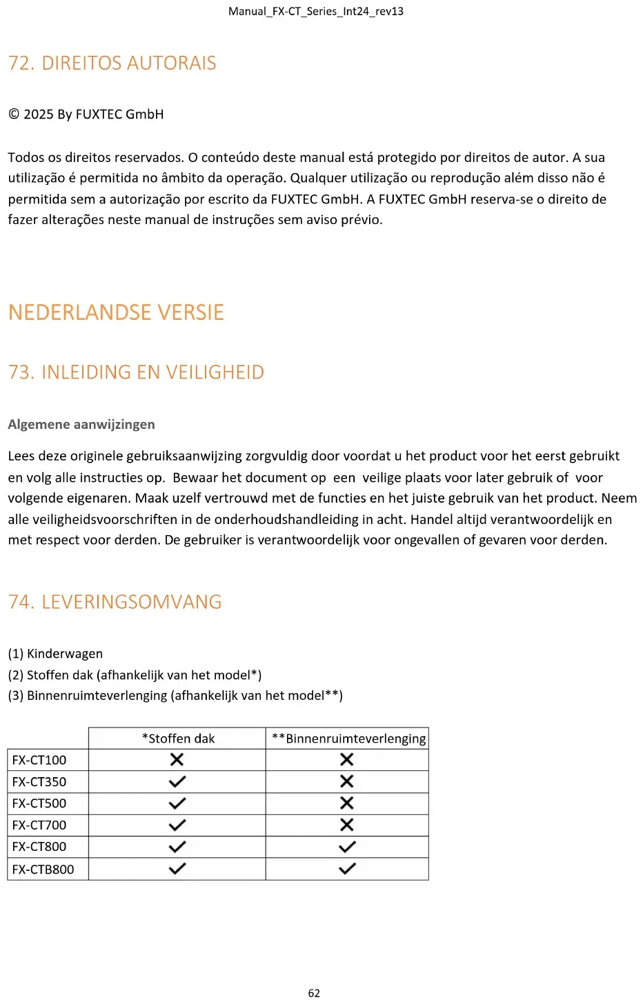 Korte en lange matten (verkrijgbaar voor alle CT500- en CT700-modellen) Transparante regenhoes (beschikbaar voor CT500, CT700 + CT800) Zonwering en muggennet (beschikbaar voor modellen CT500, CT700 + CT800) Veiligheidsgordels in verschillende kleuren (beschikbaar voor alle modellen) Thermische tassen in verschillende kleuren (beschikbaar voor alle modellen)Manual_FX-CT_Series_Int24_rev13