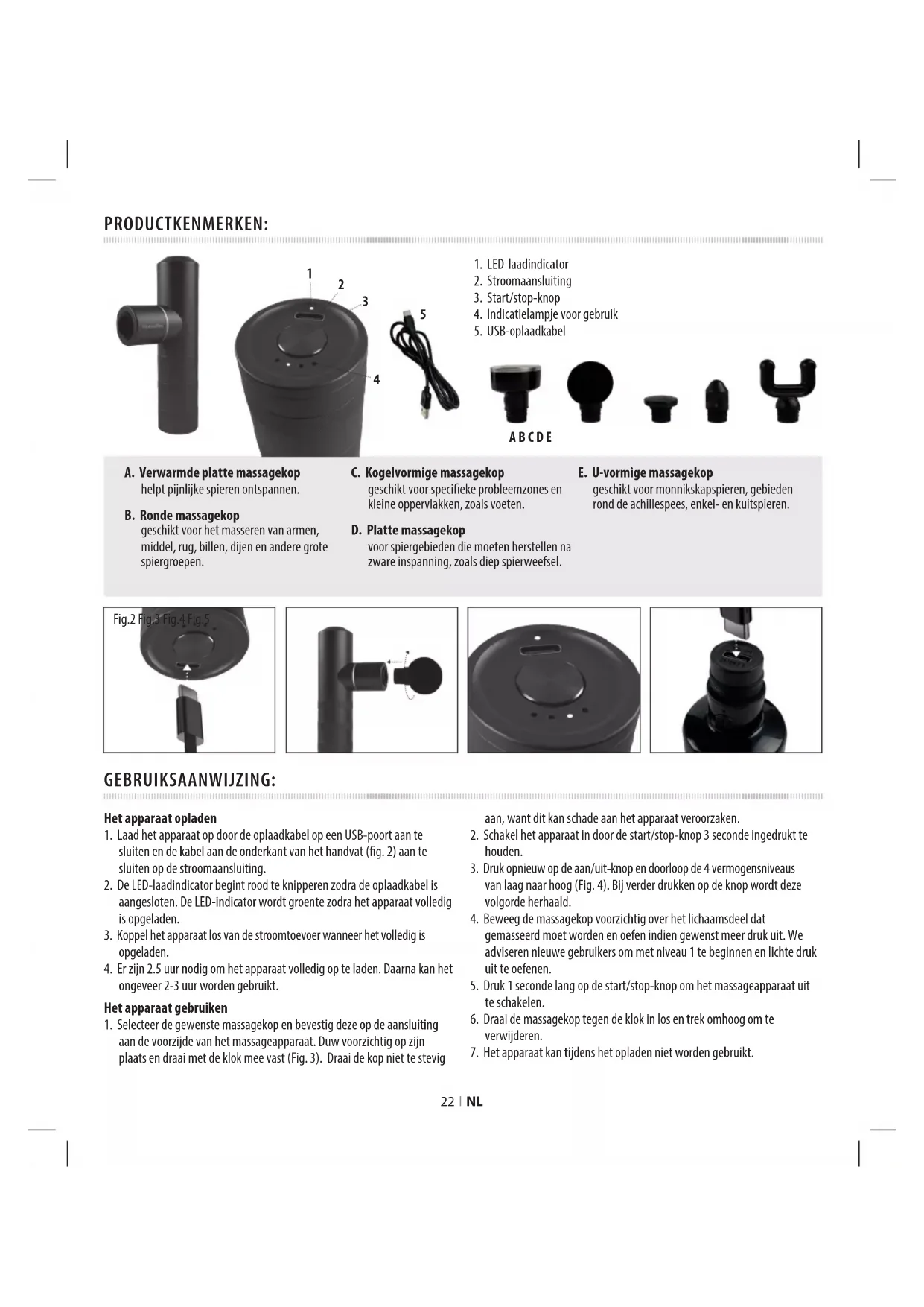 A B C D E22 I NL De verwarmde platte massagekop gebruiken De verwarmde platte massagekop warmt binnen 15 seconden op en is ideaal om pijnlijke spieren te helpen ontspannen.